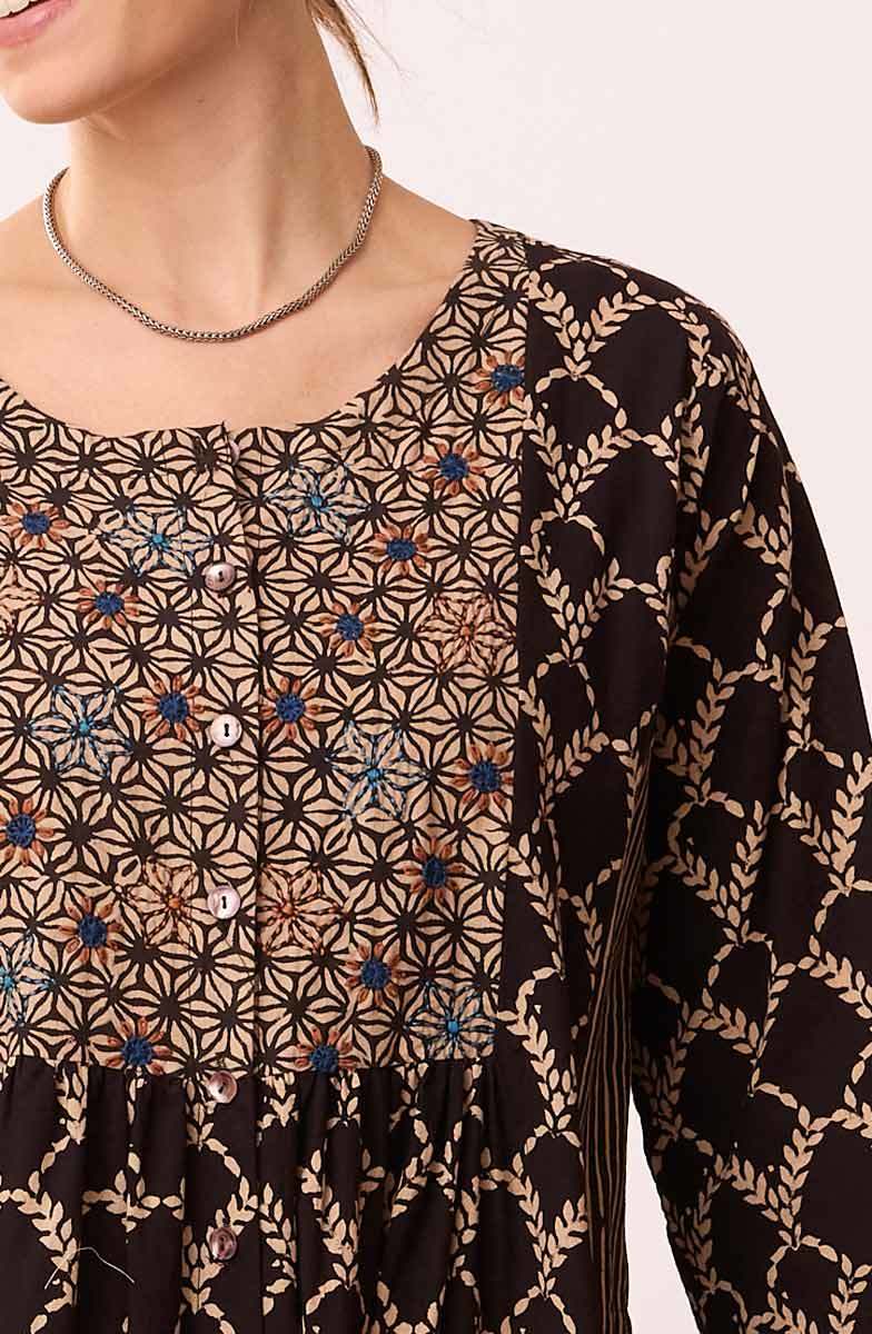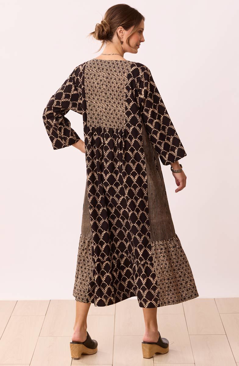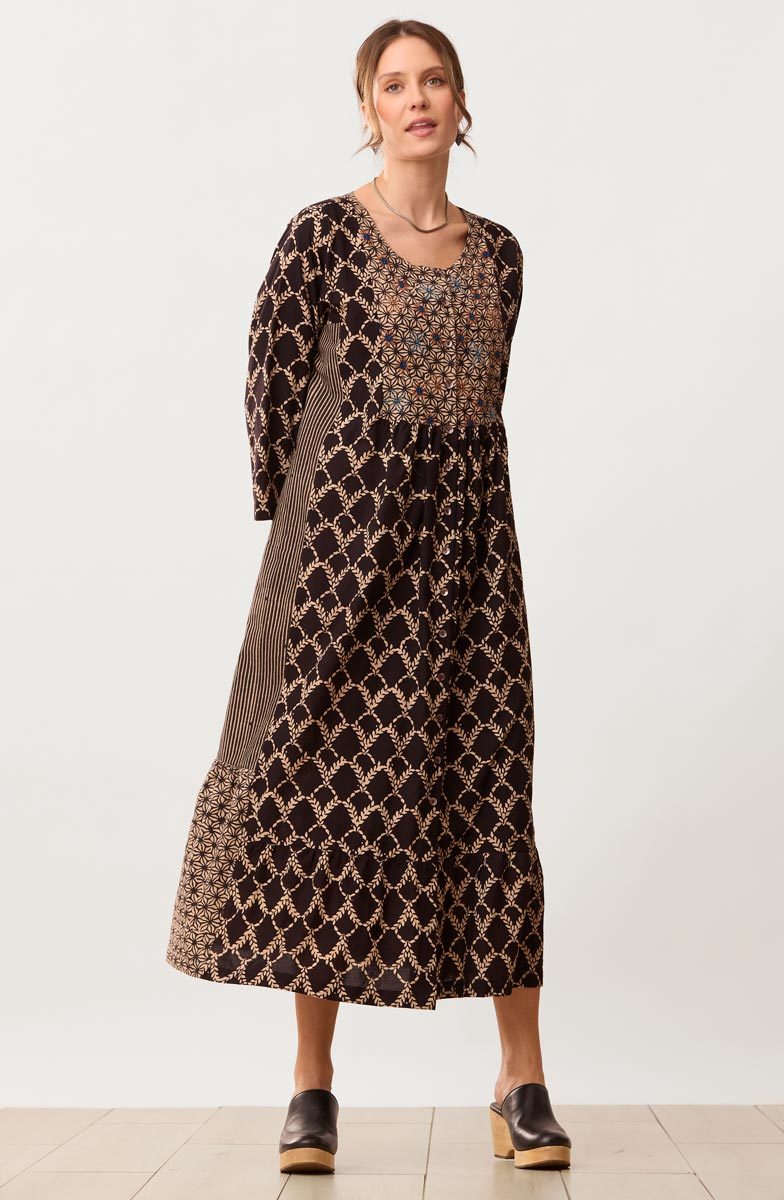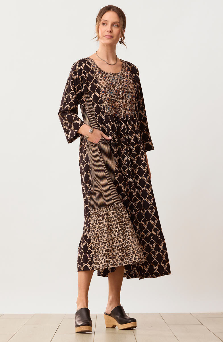 Our long dress artfully combines three natural dye blockprints in black and sandy tan. The unique bottom flounce has contrasting side panels for a special sweep. Front and back yokes give gentle gathers. Hand embroidery embellishes the front yoke. Full button front. Generously cut - consider sizing down for a less oversized look.