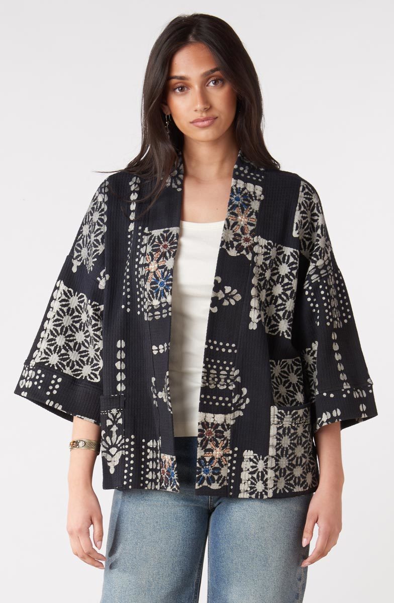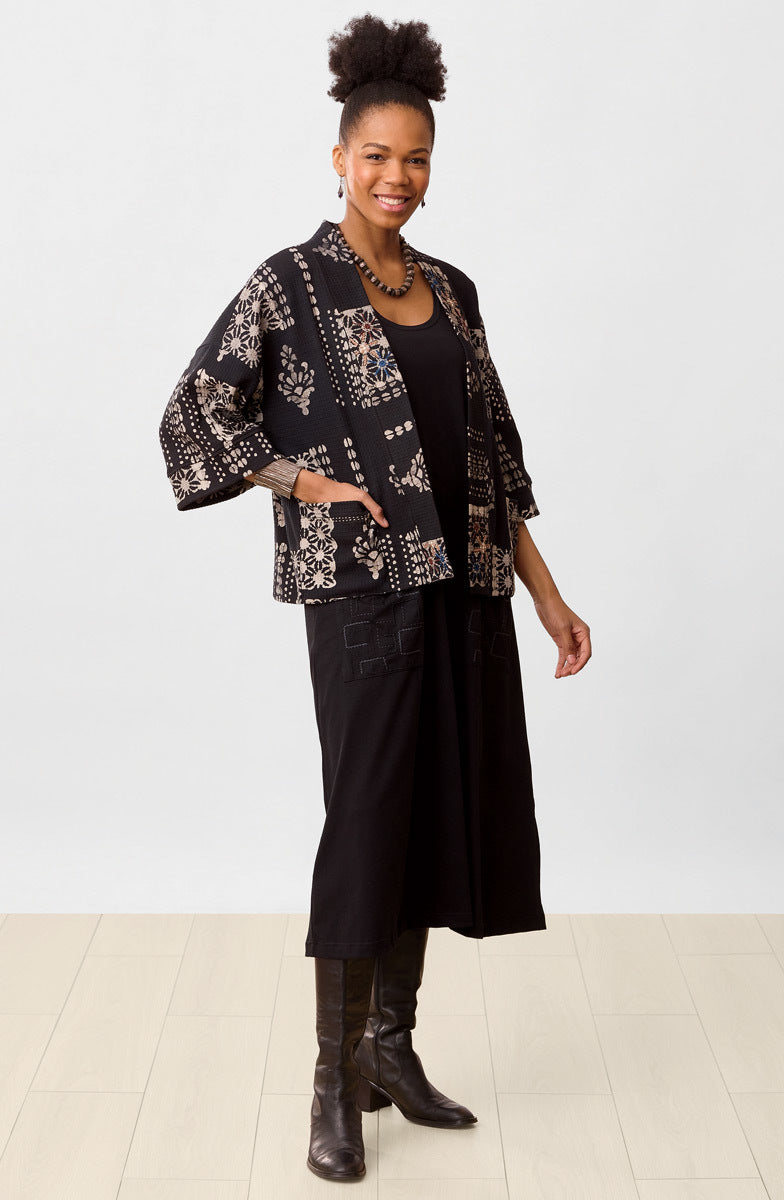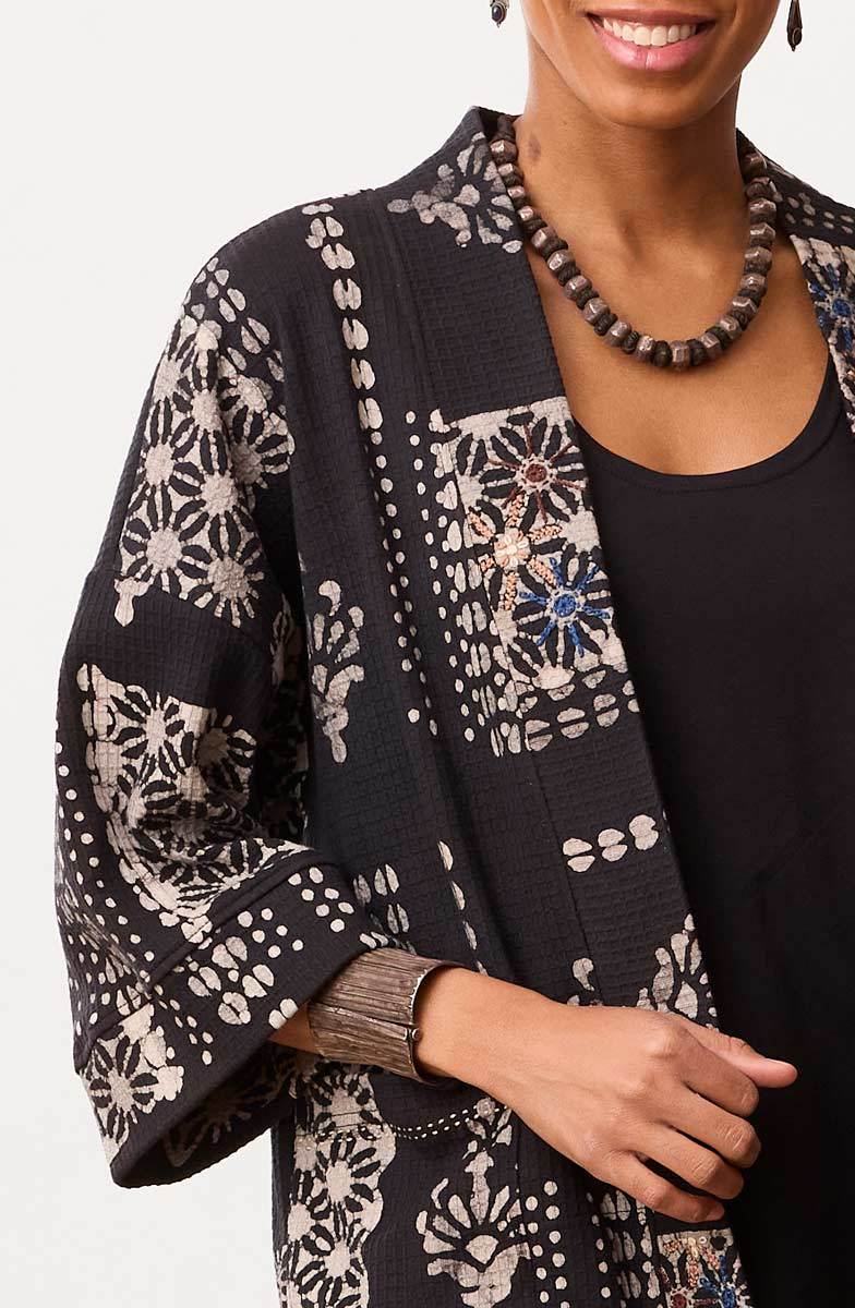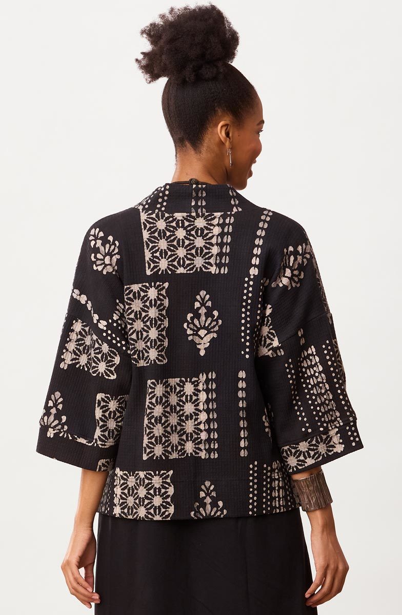 Meet the little jacket that could go with everything everywhere. Simple yet distinctive, this lively waffle-knit jacket in ivory-white batik block print on soft black is ready for cooler weather. Hand embroidery on the wide lapels and pockets. Dropped shoulders with three-quarter length sleeves. No closure.