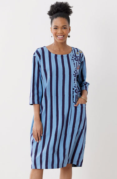 Easy scoop neck knit shift dress with block print stripes has a contrast panel with hand embroidery. Three-quarter length sleeves. Ready to go when you are!