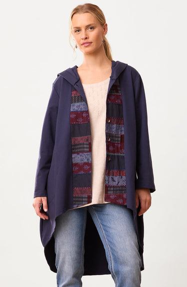 A French terry hoodie with an elevated mixed-media flair. The dark blue knit A-line cover-up features a hand embroidered upcycled Chindi patchwork placket so that you can button-up in style! The graceful high-low curved hem gives a great sweep. Curved side pockets are defined with a decorative seam. Chindi patchwork colors and patterns may vary due to the variety of upcycled fabrics.