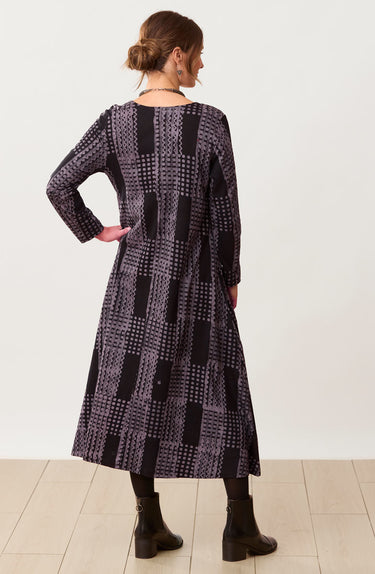 Fair Trade, Made by Utsaah Cooperative All the things you love about the MarketPlace favorite A-line jersey dress, plus long sleeves! This grey and black batik blockprinted mid-length dress is ready to wear everywhere all year round. Copper and grey hand embroidery accents the bodice.