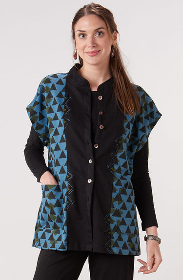 Fair Trade, Made by Ghar Udyog Collective Our soft and cozy extended shoulder knit jacket, blockprinted on blue organic French terry. The solid black center panel with button closure is hand embroidered. Generously-sized vest is ready to wear alone or layered. Consider sizing down for a less oversized look.