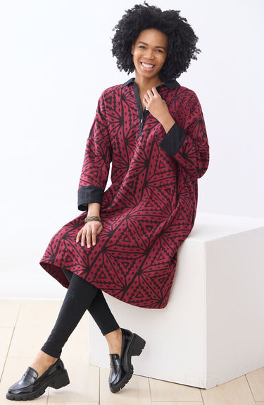 Tunic and dress in one great style. Our autumn-weight maroon French terry tunic with black blockprint has a woven contrast shirt-collar, placket and cuffs. Dropped shoulders, three-quarter length sleeves. Hand embroidery accents the print design. Generously cut - consider sizing down for a less oversized look.