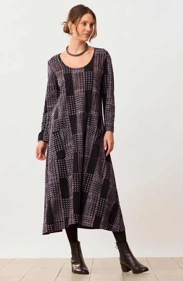 Fair Trade, Made by Utsaah Cooperative All the things you love about the MarketPlace favorite A-line jersey dress, plus long sleeves! This grey and black batik blockprinted mid-length dress is ready to wear everywhere all year round. Copper and grey hand embroidery accents the bodice.