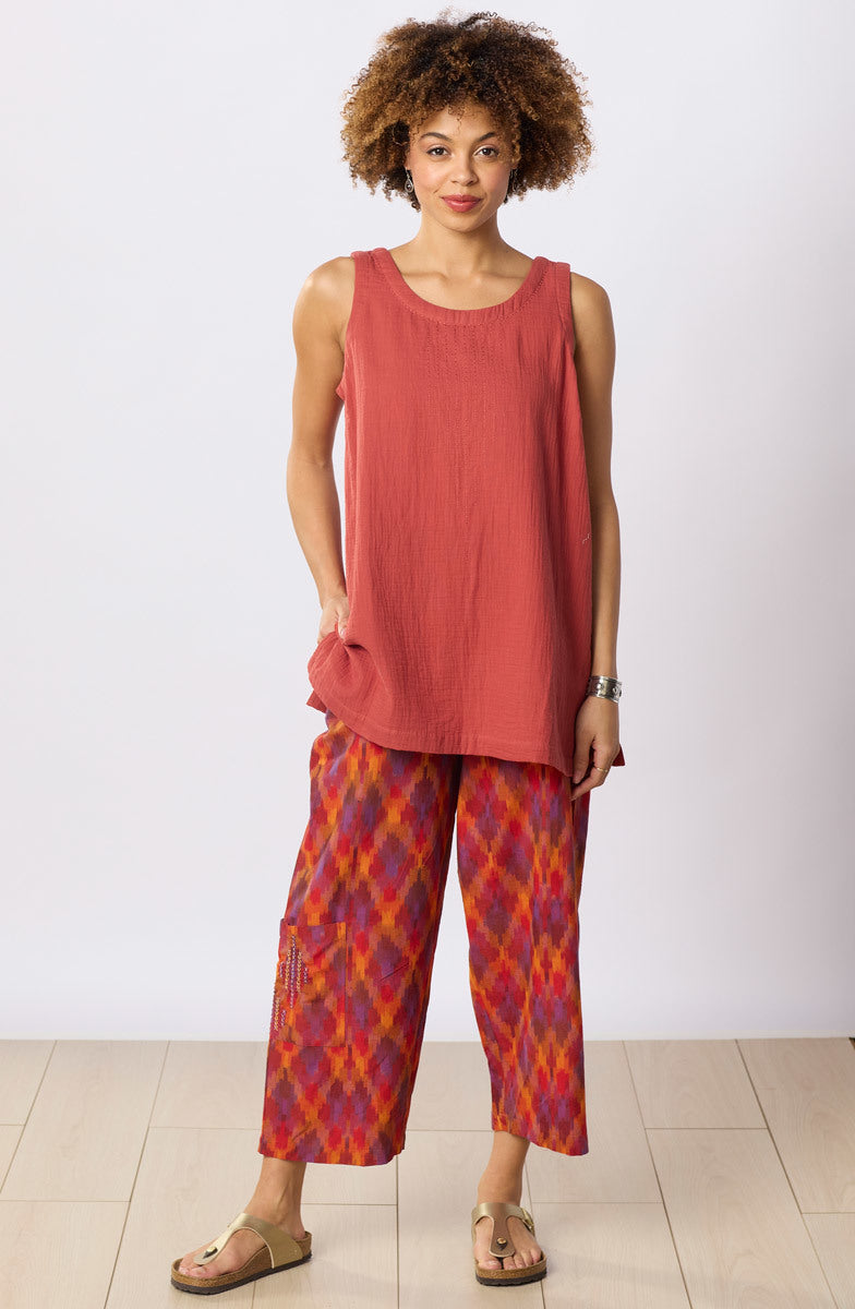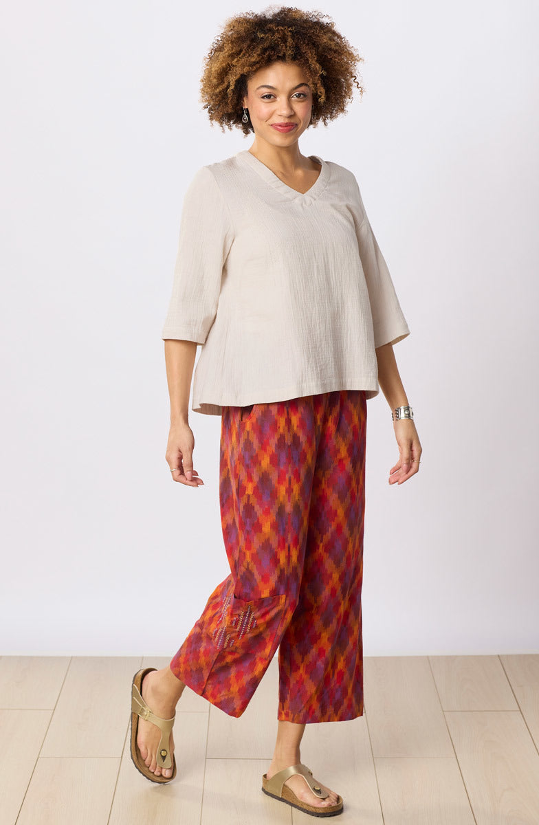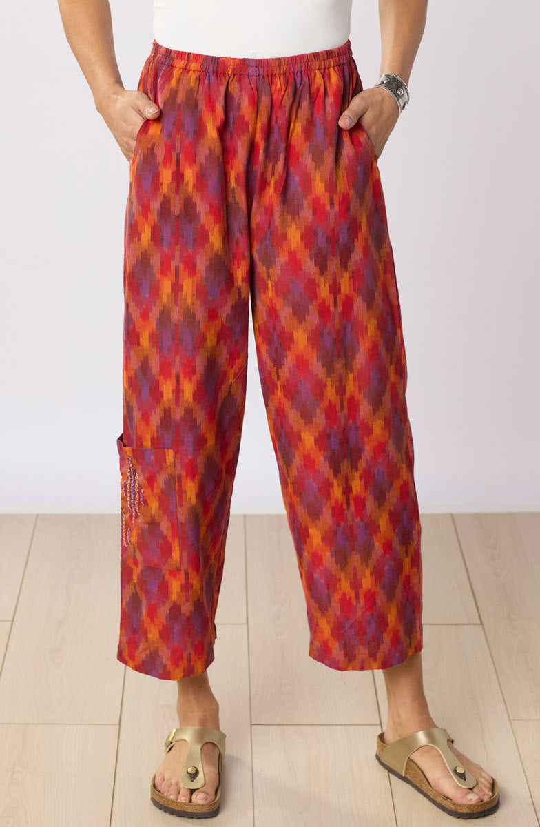 Fiery reds, oranges and purples are woven into our energetic ikat straight leg pant. The flood length pull-on style sits at natural waist with an easy fit through hip and thigh. Hand embroidery accents the cargo pocket.