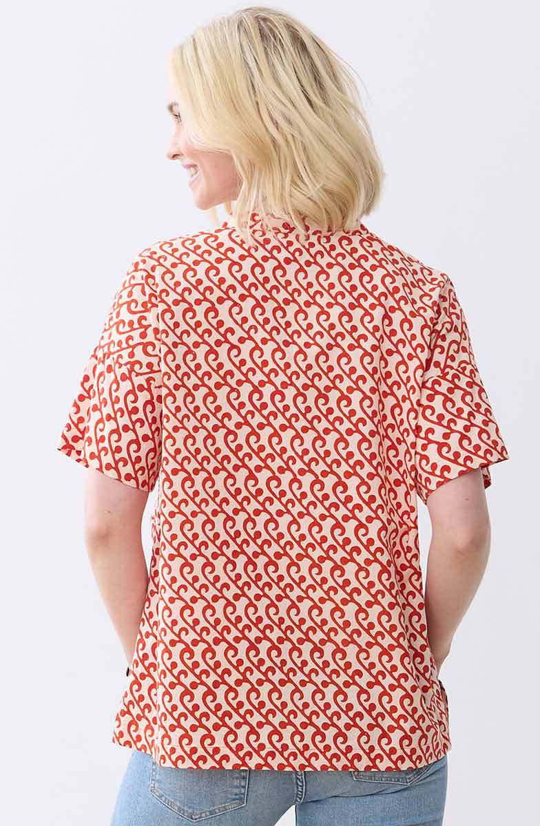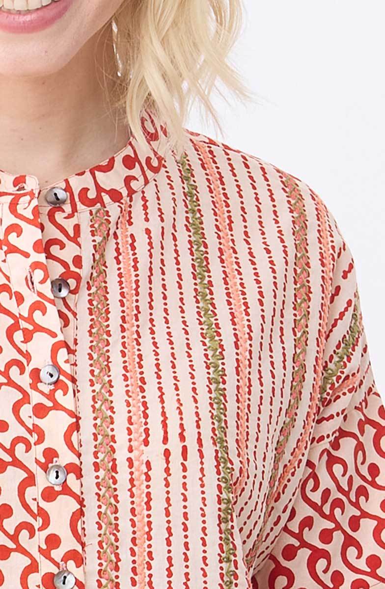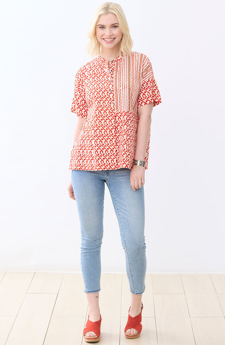 Fair Trade, Made by Ranphul Cooperative Comfortable easy shirt blockprinted in red features a handprinted contrast panel with colorful hand embroidery accents. Dropped shoulders with contrast sleeves. Side slits. Hand embroidery accents. Generously cut - consider sizing down for a less oversized look.
