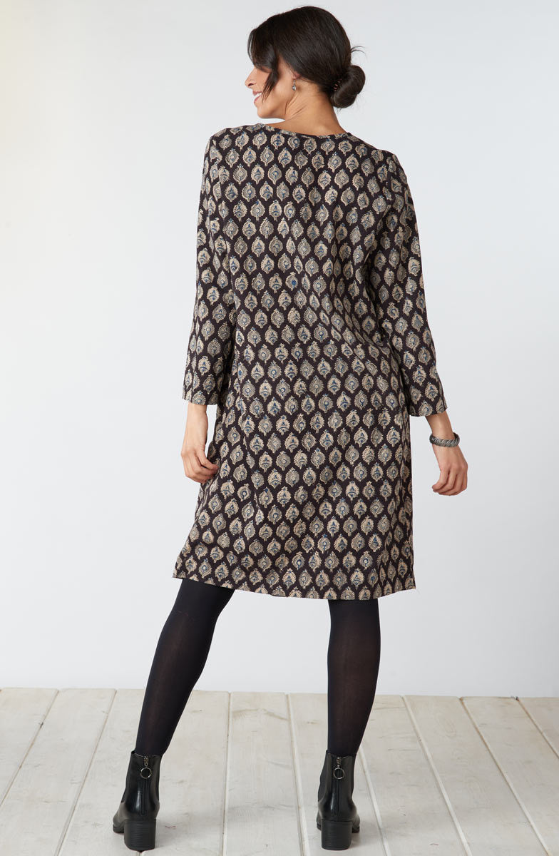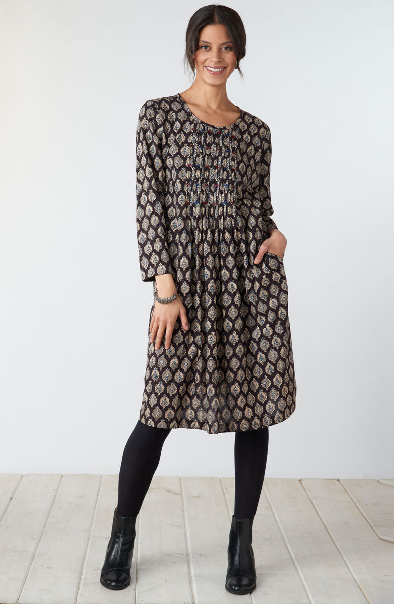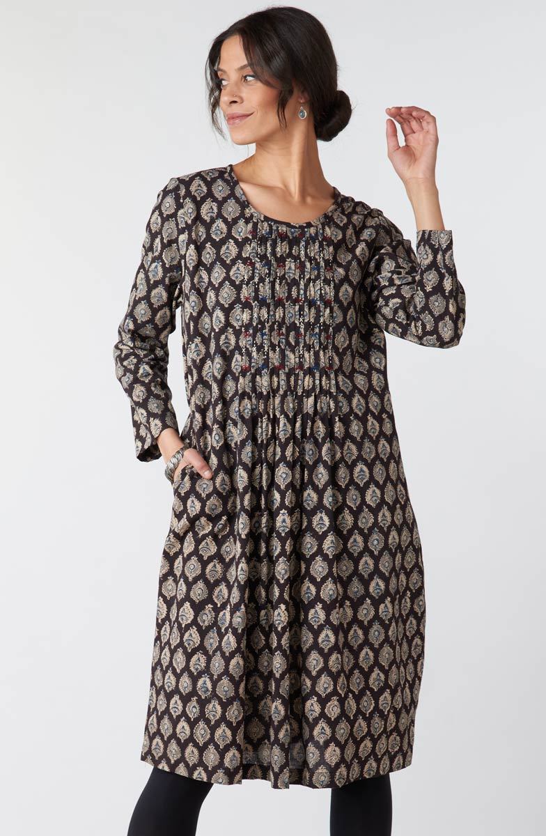 Effortless Kalamkari pullover dress handprinted in grey, beige and blue natural dyes. Hand embroidered pintucks give a gentle gathering to the skirt. Ready to double as a tunic.