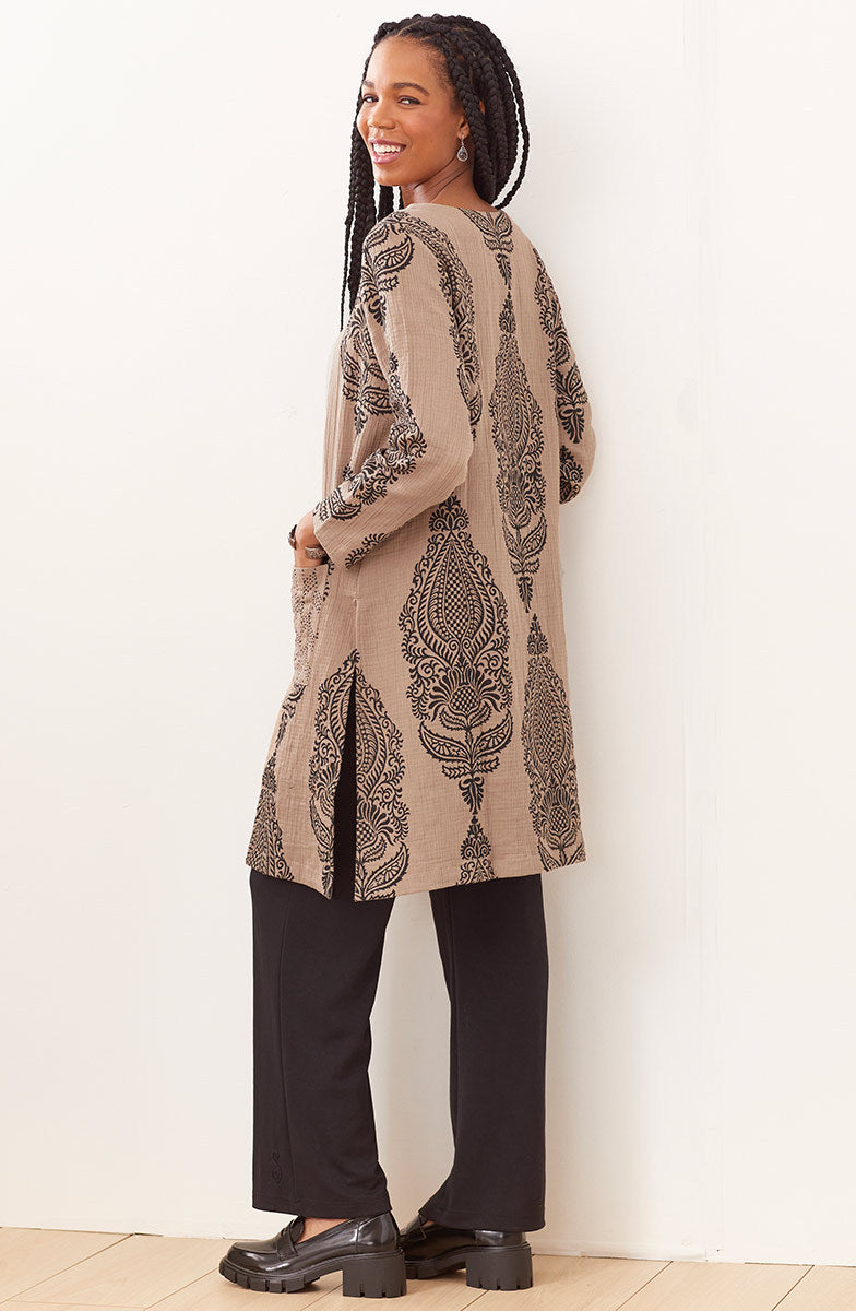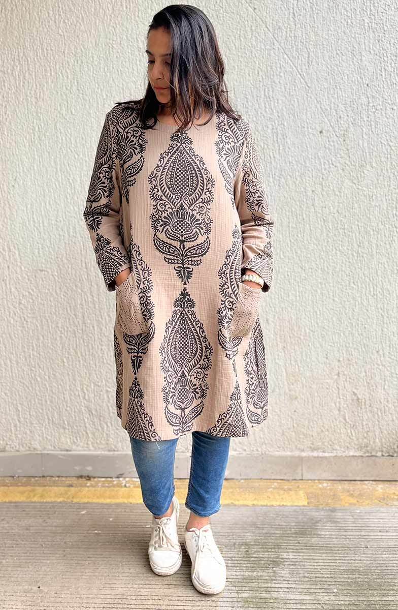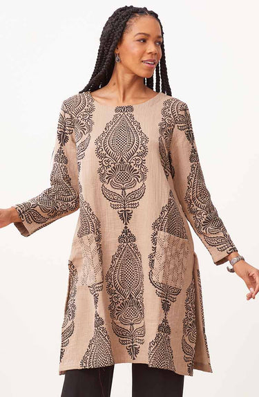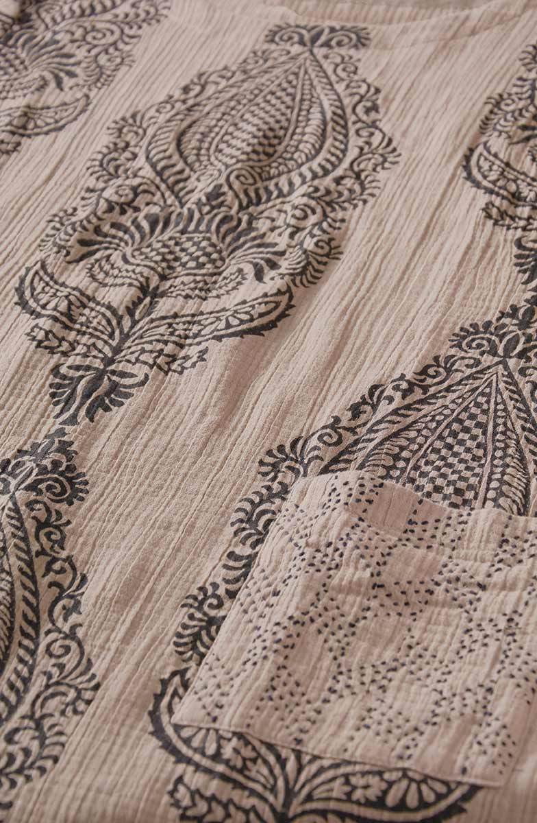 Intricate placement prints make this oatmeal-beige double gauze kurta tunic something very special. Side slits. Hand embroidery accents the contrast front pockets.