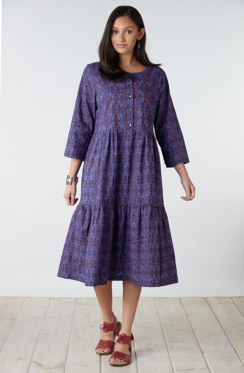 Our artistic and sophisticated Misses fair trade dresses, available in striking colors and print combinations that will elevate your wardrobe. Handcrafted by women artisans in India from 100% cotton and jersey knit fabrics. These womens dresses come in a variety of cuts to match your style: whether you prefer fit and flare dresses, tunic dresses or kaftans, we have something for you. Wear them alone, or layered over our pants, or pair with a jacket. Also available in women's plus sizes.