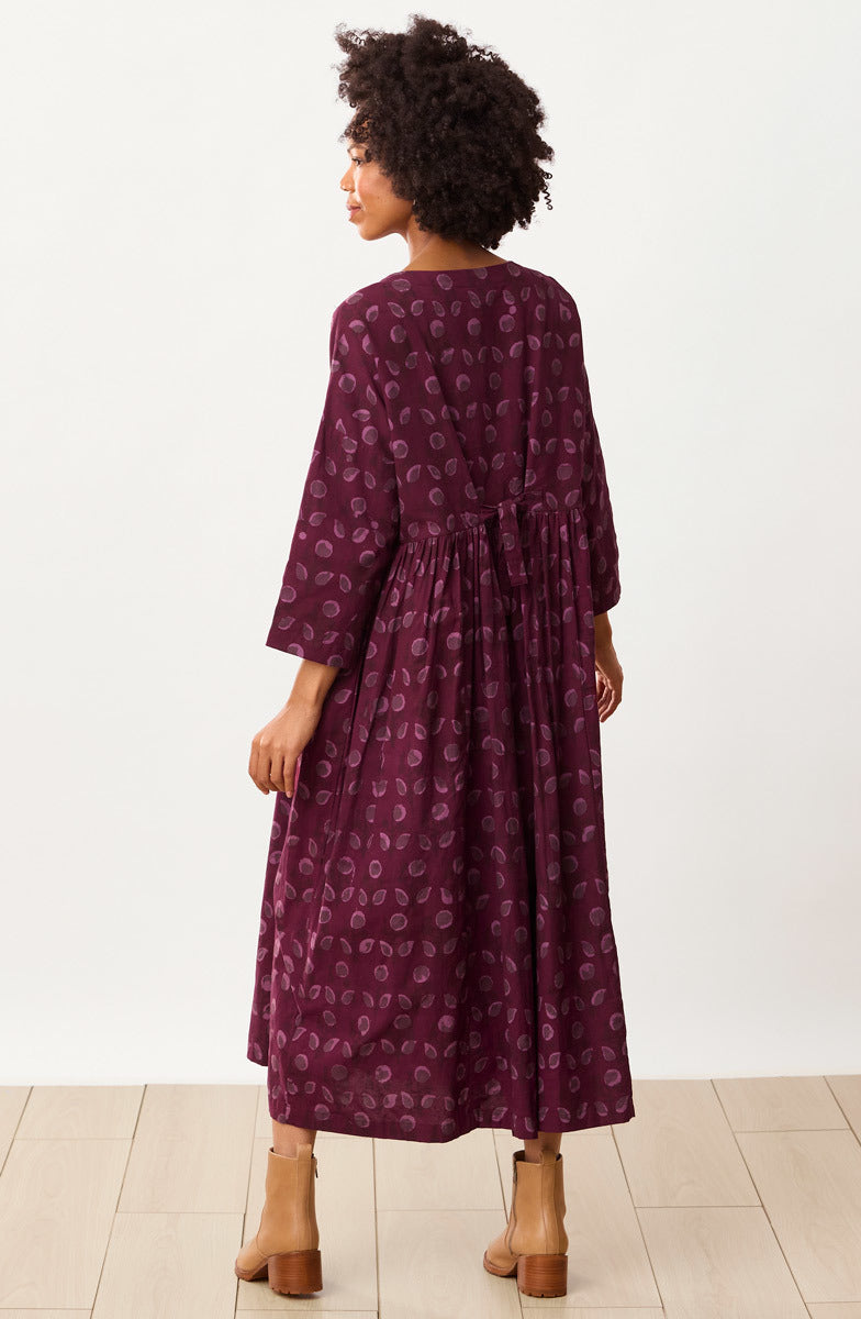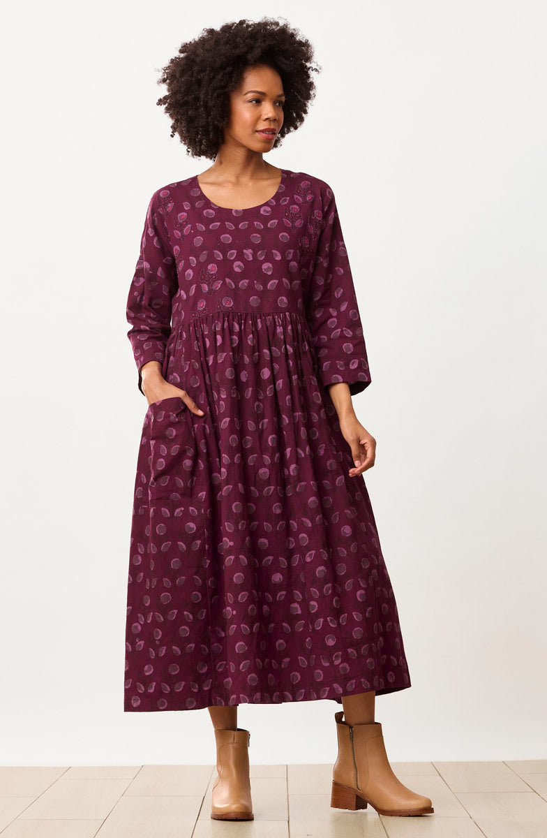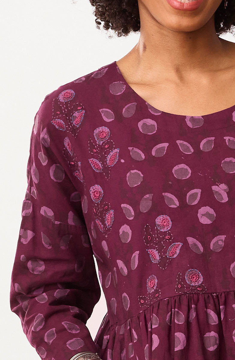 Easy-on and ready to go, this scoop-neck long dress is batik block printed in dark purple with light purple and green accents. The gently gathered skirt has an easy sweep. Hand embroidered florals embellish the bodice. Dropped shoulders and three-quarter-length sleeves. Generously sized, with back tab ties to let you adjust to your preferred fit.