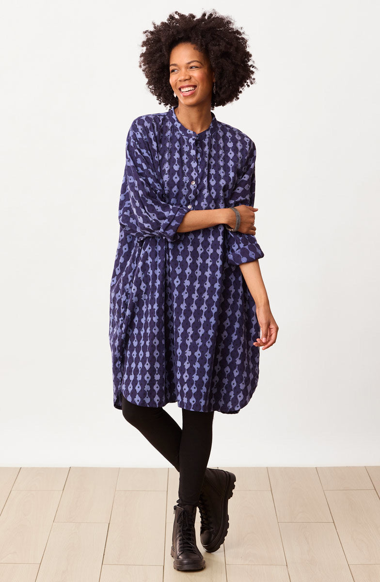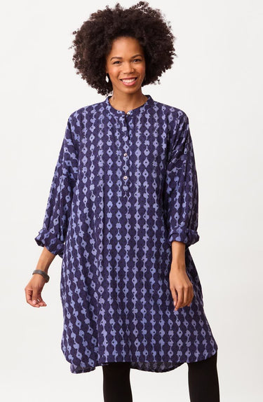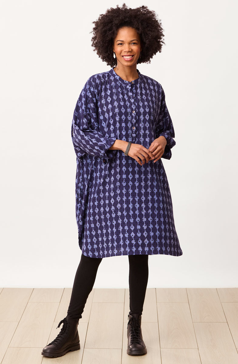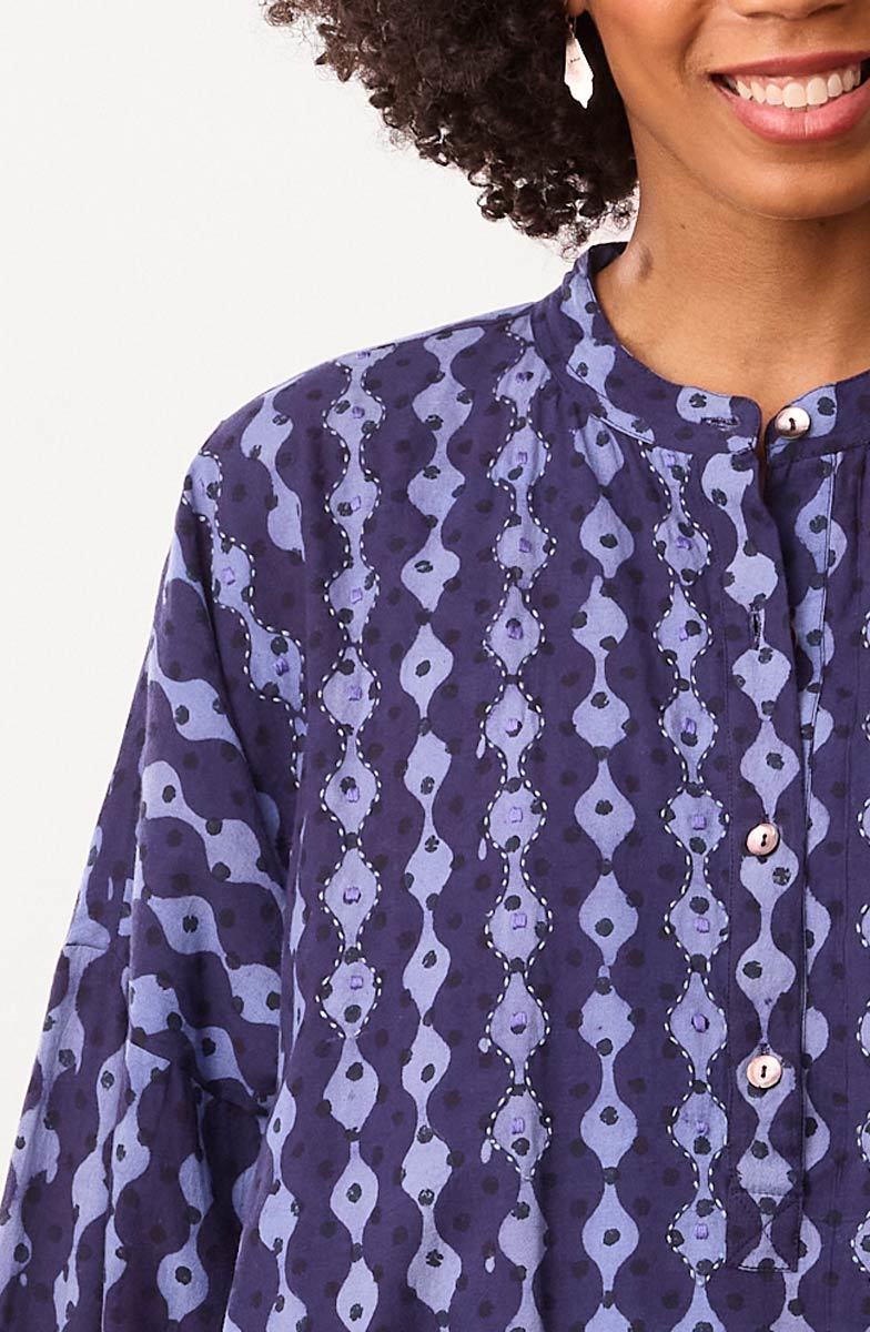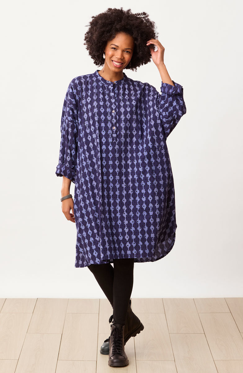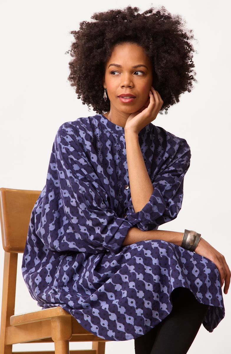 Easy big-shirt-style kaftan works as a tunic or a dress. Blockprinted in two shades of relaxing blue, this top features a high-low shirttail hem and dropped shoulders with button-cuff tapered sleeves. Hand embroidery highlights the print design. Generously sized.