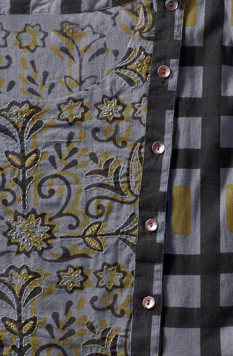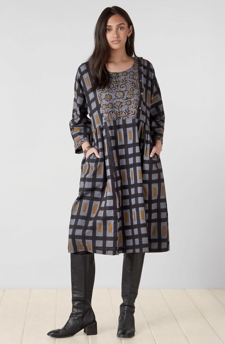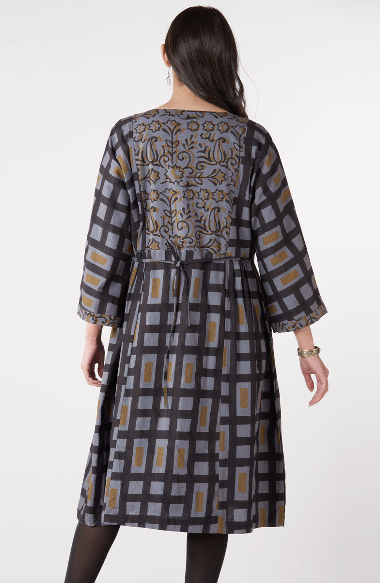 Easy scoop-neck cotton dress with a button placket at the side of the front yoke is blockprinted in blue and dark grey with accents of yellow-green. Dimensional hand embroidery embellishes the front yoke. Side gathers give a good sweep. Back ties allow you to adjust to your preferred fit.