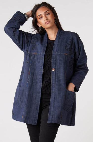 Our cozy autumn-weight swing jacket in two exciting reversible styles. One side has a mix of natural dye cream-color block prints on black, and the reverse is wear-everywhere blockprinted denim made from upcycled yarn. Hearty denim handwoven with recycled fibers blends strength and eco-consciousness, while the incorporation of recycled materials reduces waste. One-button closure. Hand embroidered accents on both sides. Generously styled for a great sweep - consider sizing down for a less oversized look.
