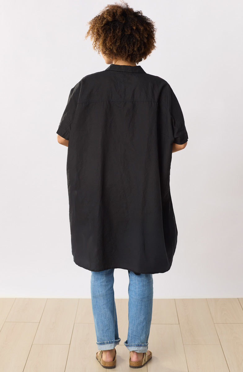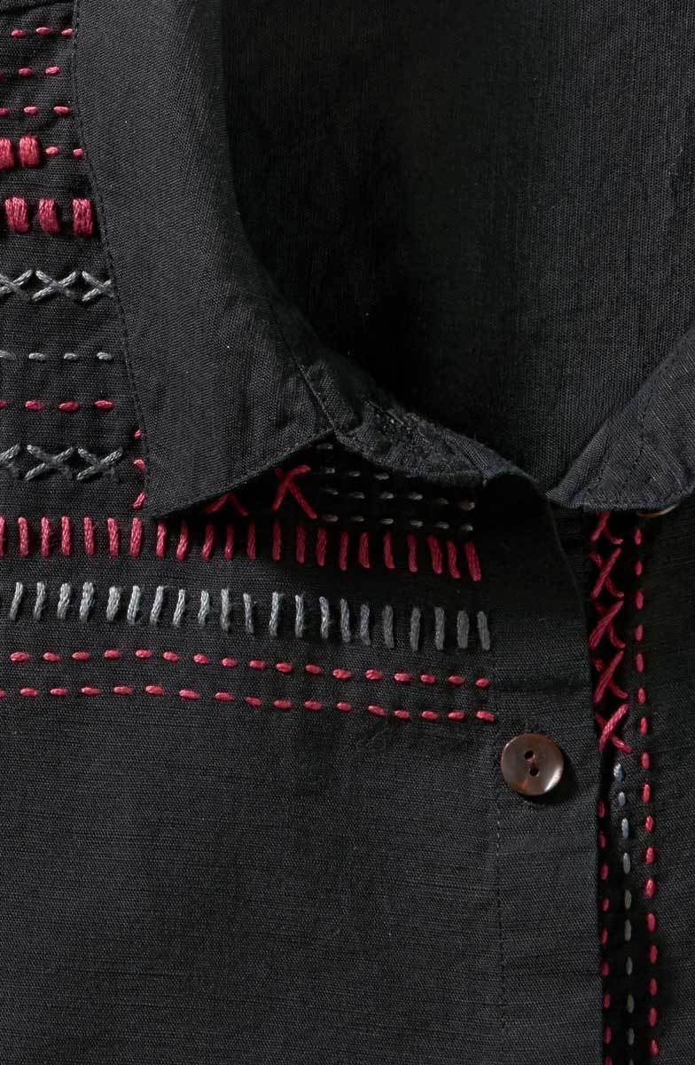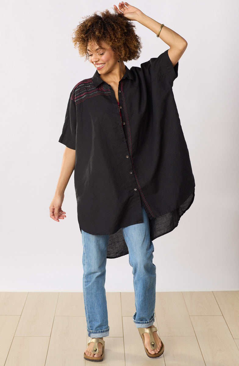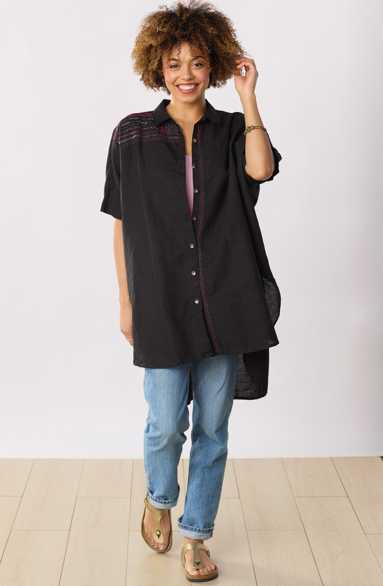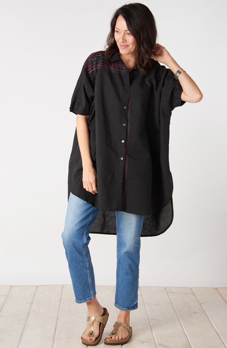 Shirt styling in basic black with colorful hand embroidery highlights, this linen/cotton blend big shirt is generously styled with dramatic dolman sleeves, a high-low shirttail hem and deep side slits for a great sweep.