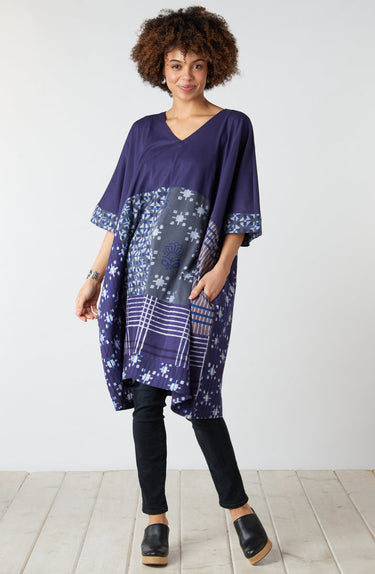 Our favorite empire-waist V-neck kaftan dress, with a deep blue jersey bodice and a woven skirt collage of grey, blue, and mauve block prints. Hand embroidery accents the waist seam. Generously sized ā one size fits most.