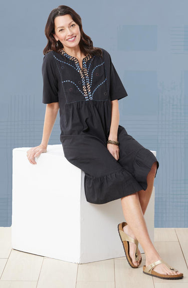 So much to love about this soft organic cotton dress! Exuberant hand embroidery decorates the notch-neck yoke, and gentle gathers at the waist and a bottom flounce give a gentle sweep. Our eco-friendly dress is ready for every occasion.