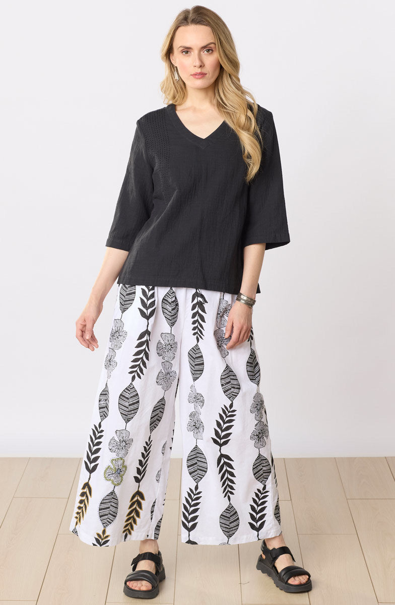 Eco-friendly organic cotton pant is handprinted with organic ink leaves and flowers. Drawstring waist has front pleats for an easy fit through hip and thigh. Hand embroidery accents on the leg.
