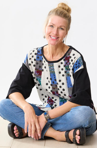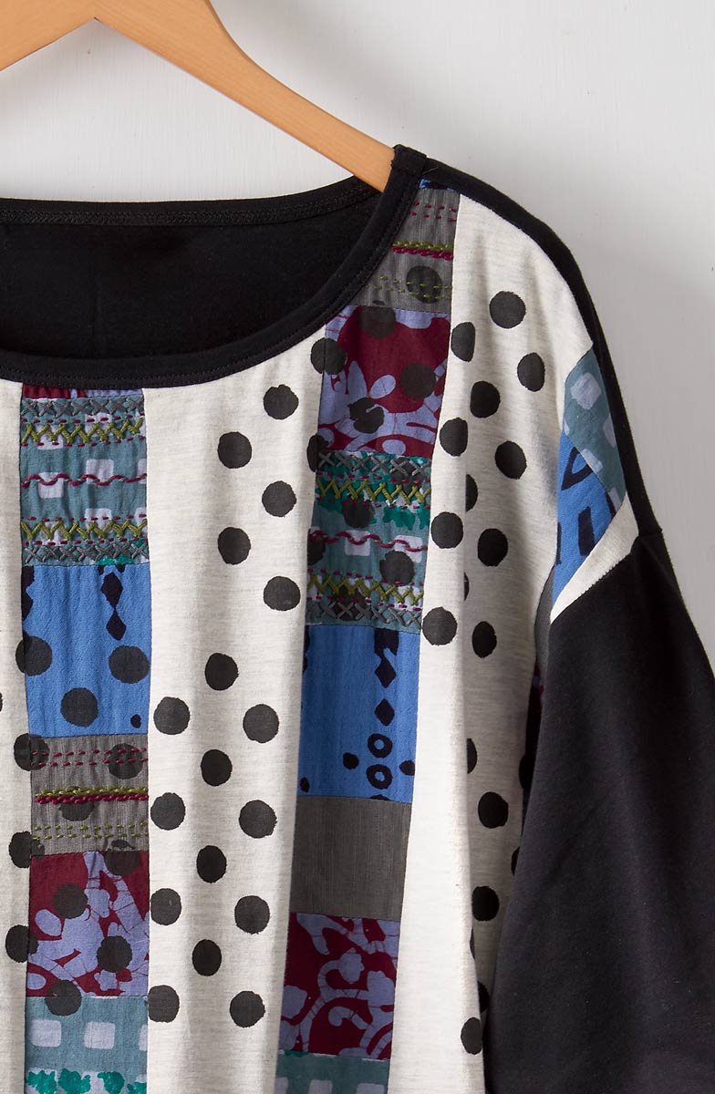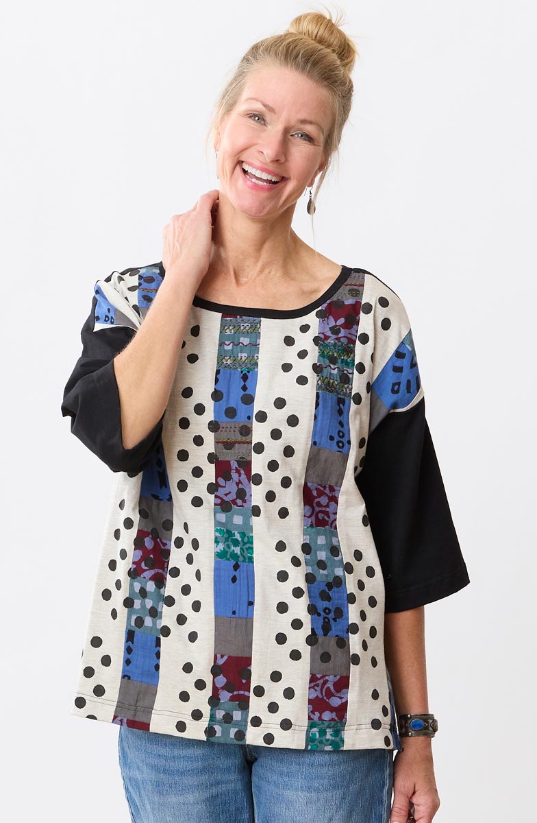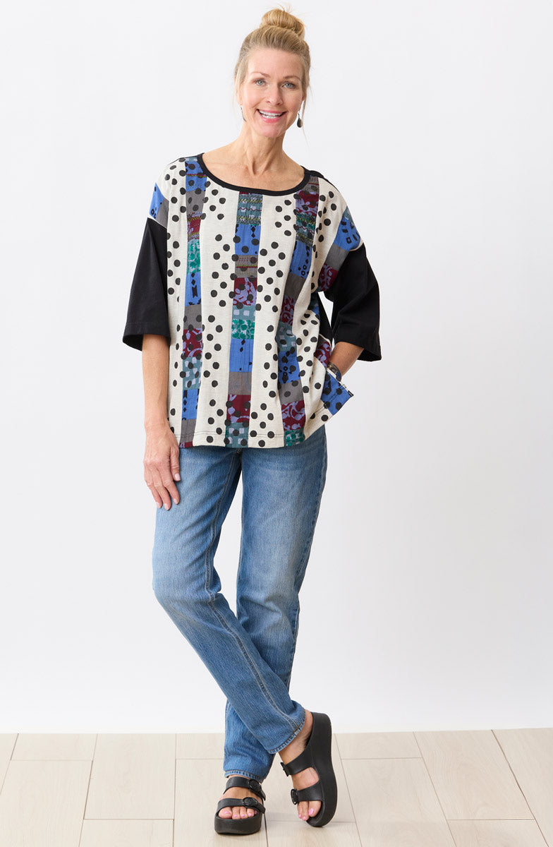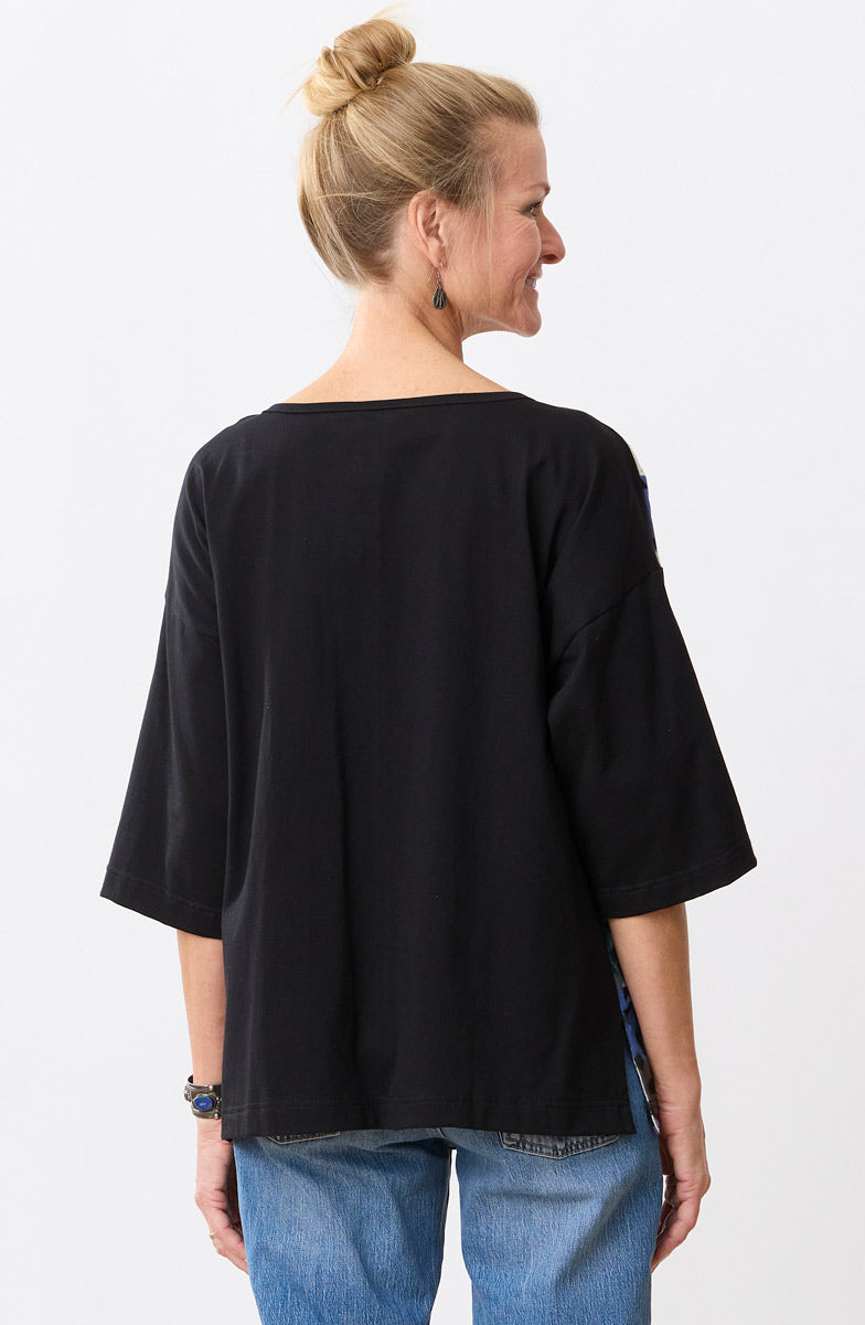 Upcycled chindi patchwork is paired with solid knit strips and overprinted to create a truly artful look—distinctively MarketPlace. The sleeves and back are in solid black jersey for contrast. Finished with three-quarter length sleeves. Due to the nature of upcycled fabrics, colors and patterns will vary.