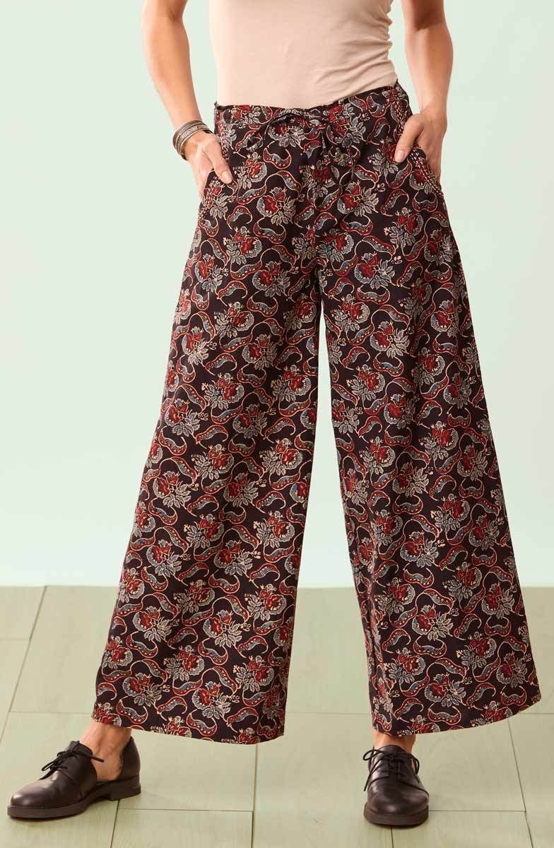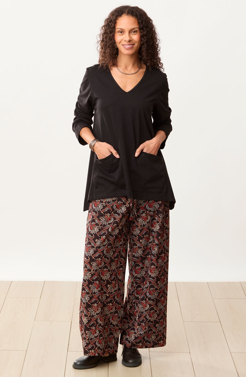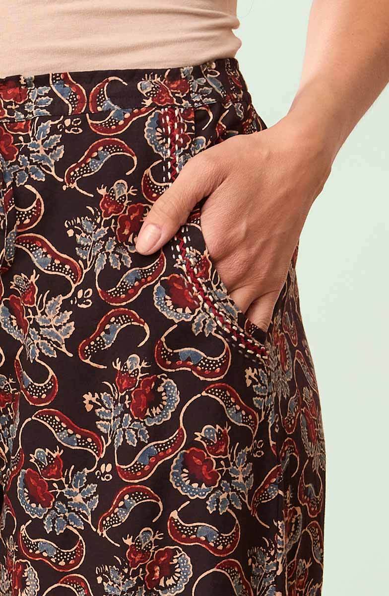 Our easy wide-leg pant in dramatic red, blue and black natural dye floral handprints on soft cotton. Flat front with drawstring, elastic back. Hand embroidery accents the curved pockets.