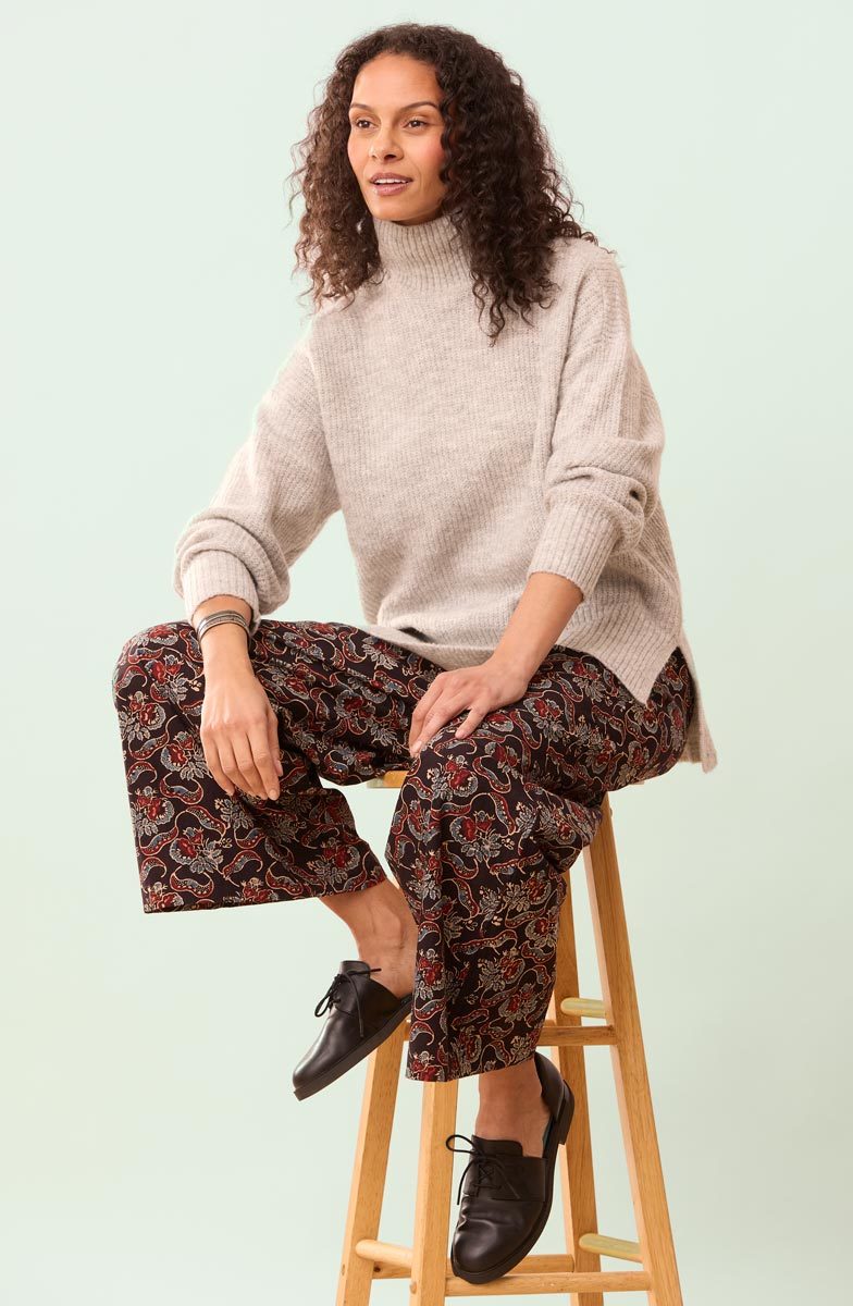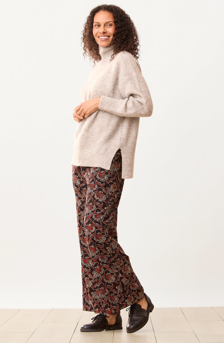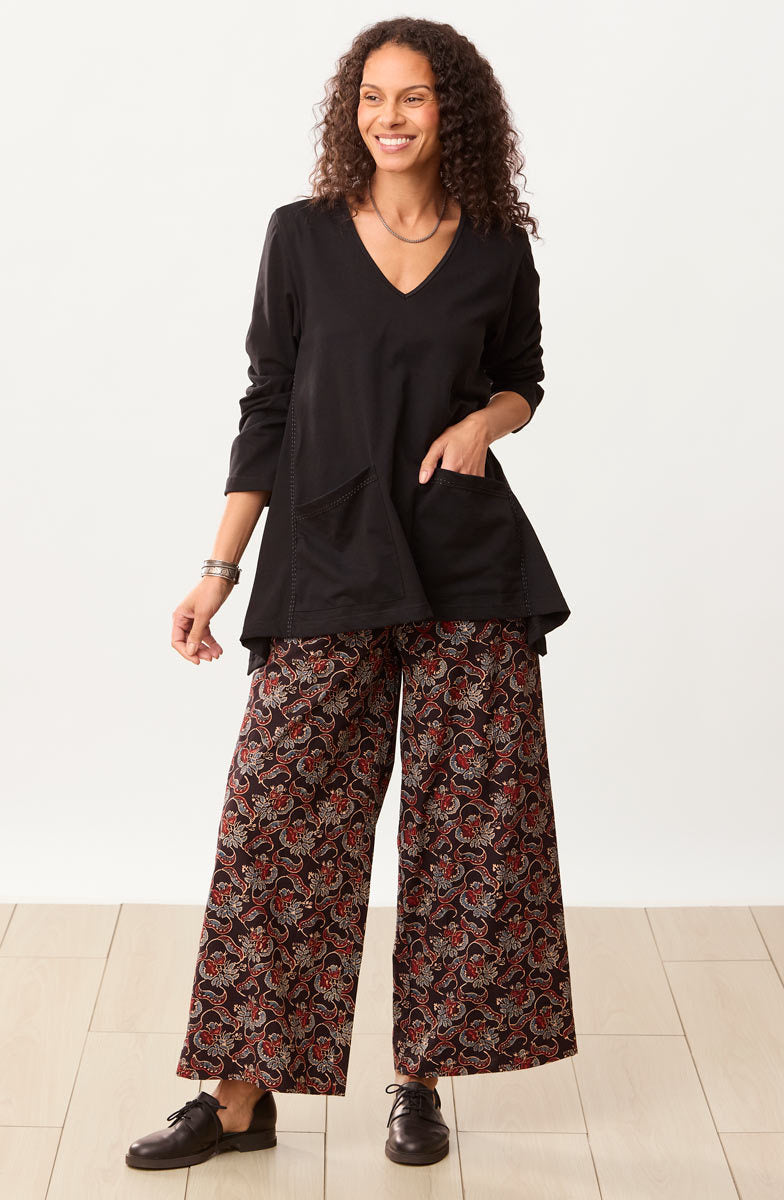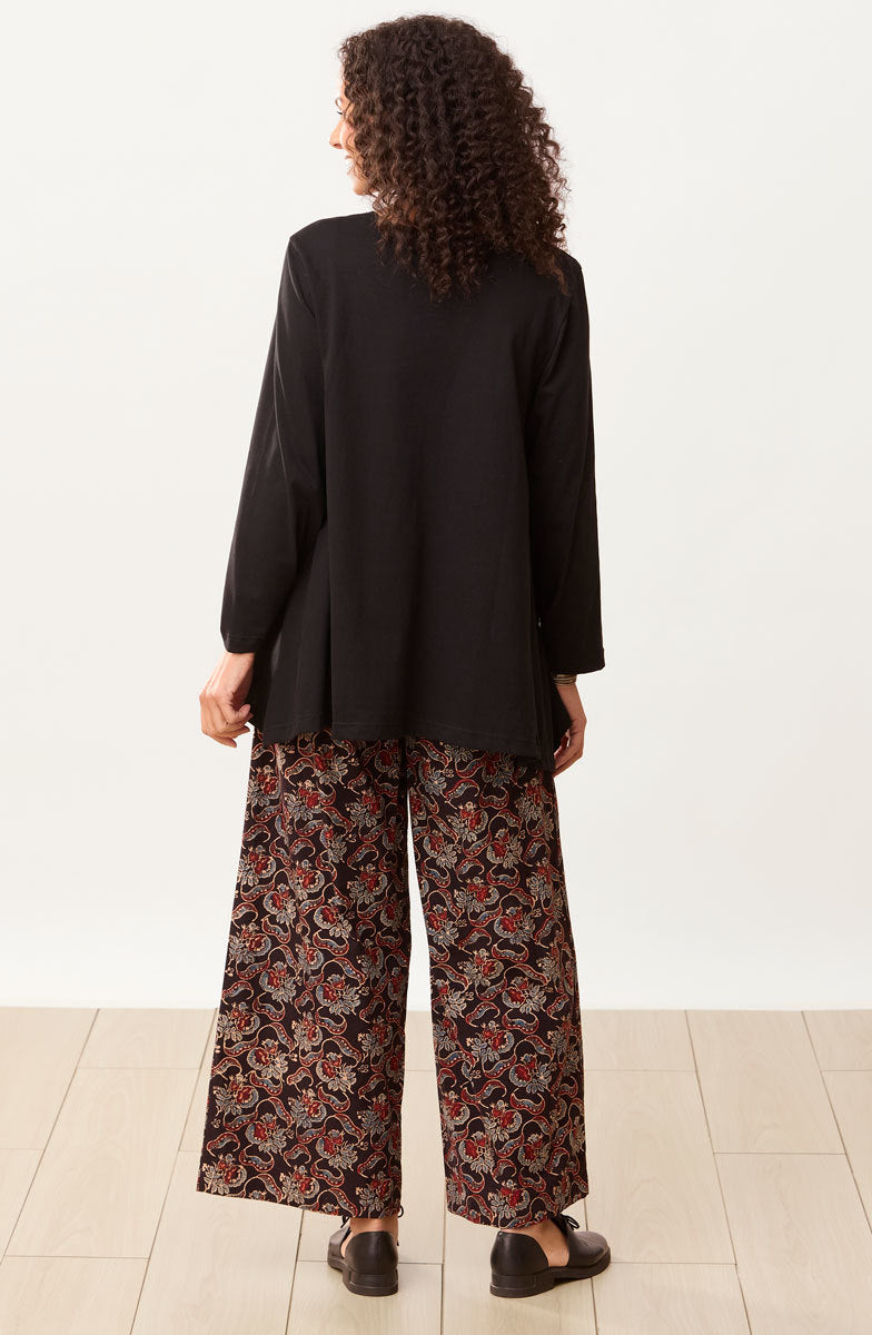 Our easy wide-leg pant in dramatic red, blue and black natural dye floral handprints on soft cotton. Flat front with drawstring, elastic back. Hand embroidery accents the curved pockets.