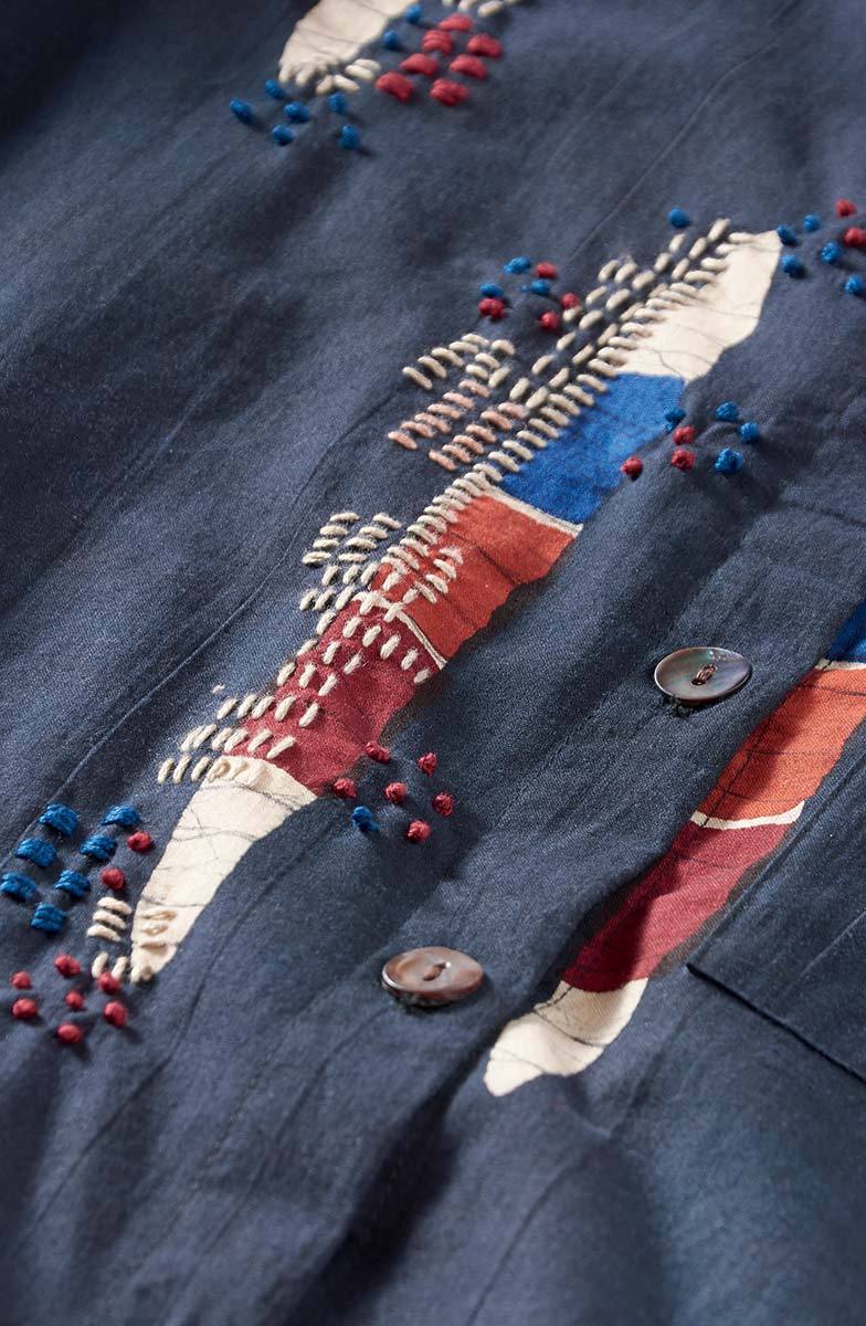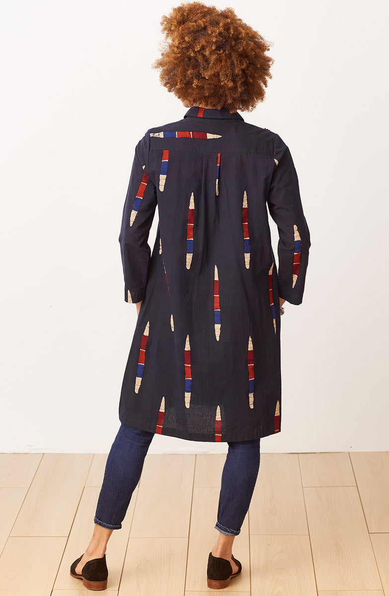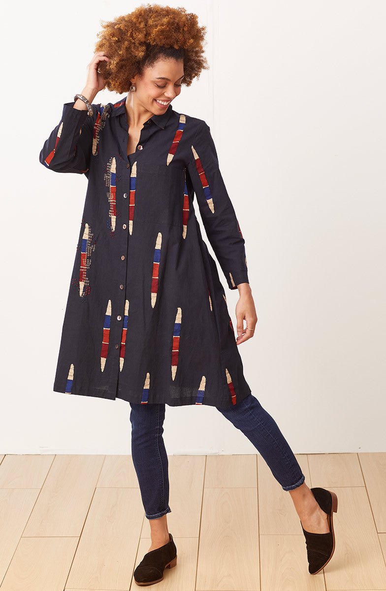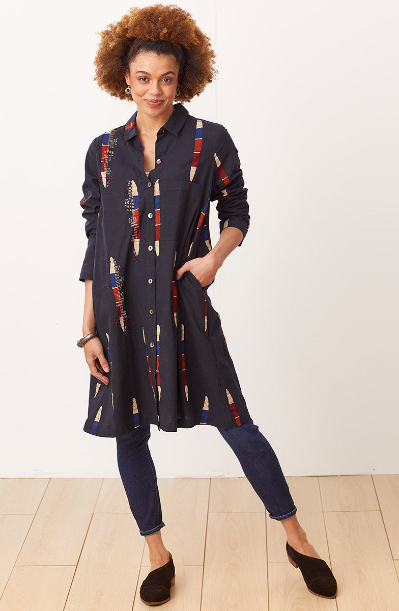 Batik block prints create slices of color on this long shirt. The versatile top can also be worn as a dress or jacket. Hand embroidery accents echo the red, blue, orange and cream color slices.