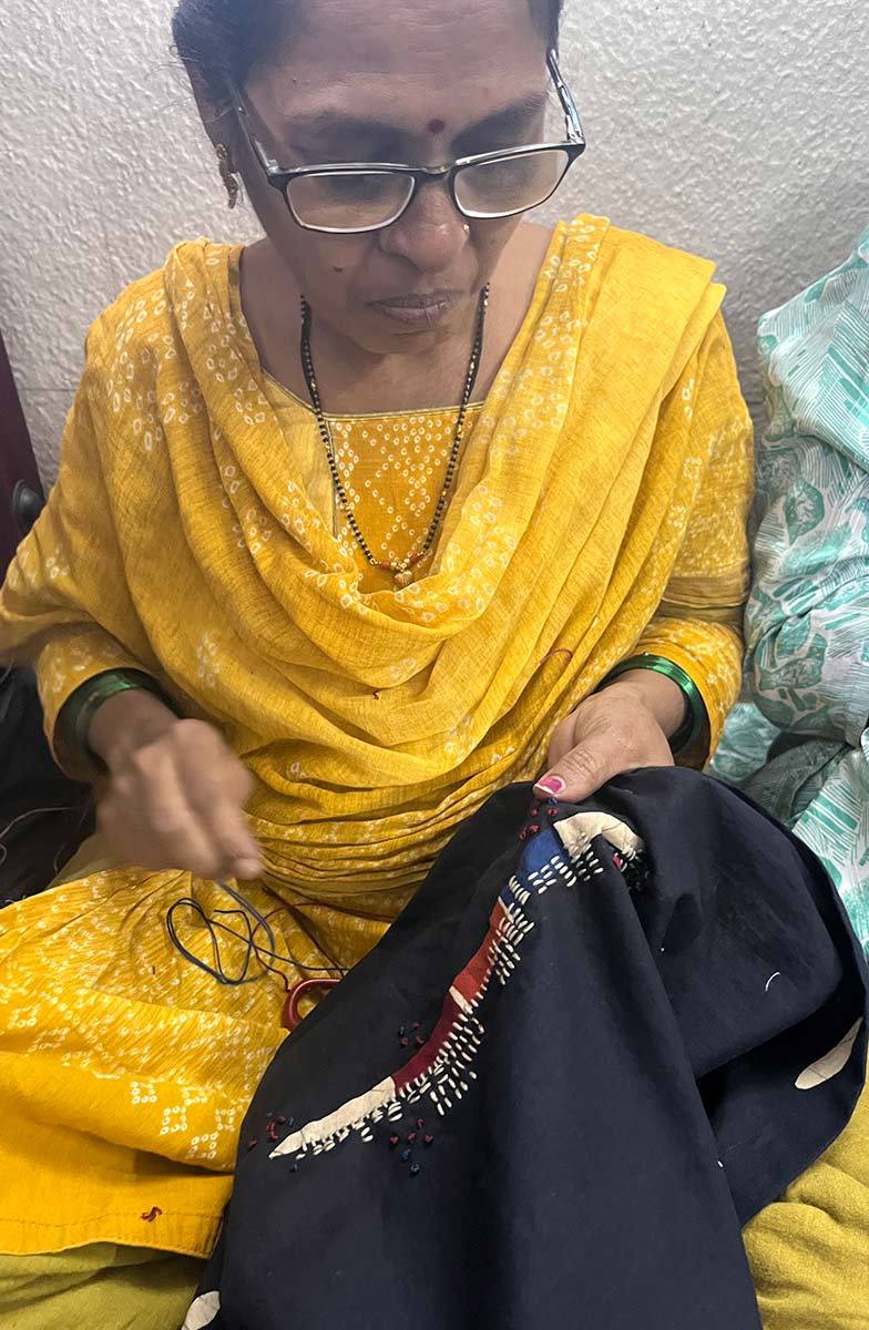 Ghar Udyog is situated in Uttan, roughly 46 km from Mumbai. Located on the coast, the surrounding area is a fairly rural area and Uttan is like a large village. This group consists of 13 tailors, 14 embroidery artisans and one supervisor. It's an interesting mixture of young and older women who originate from different parts of India. While the sewing is done at Uttan, the embroidery artisans live in Bhavander, a short distance away. The geography makes it imperative that everyone can communicate clearly and frequently with their cooperative members and staff in Mumbai. They are very committed to all the social programs for personal development and social improvement. They are also good at locating useful resources in their community. They feel these aspects describe them: