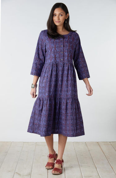 Eco-friendly organic cotton A-line dress with a swingy tiered skirt is handprinted in organic ink block prints of rich blue and red. Hand embroidery accents the print design. Three-quarter length sleeves.