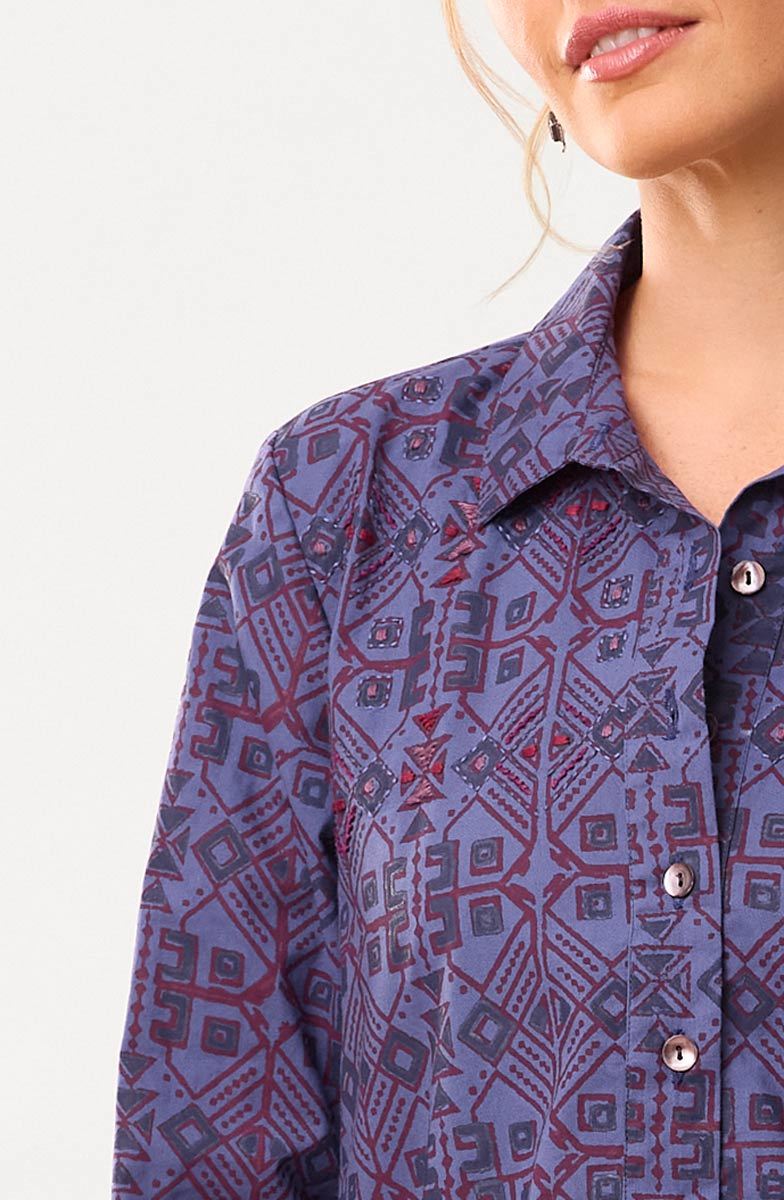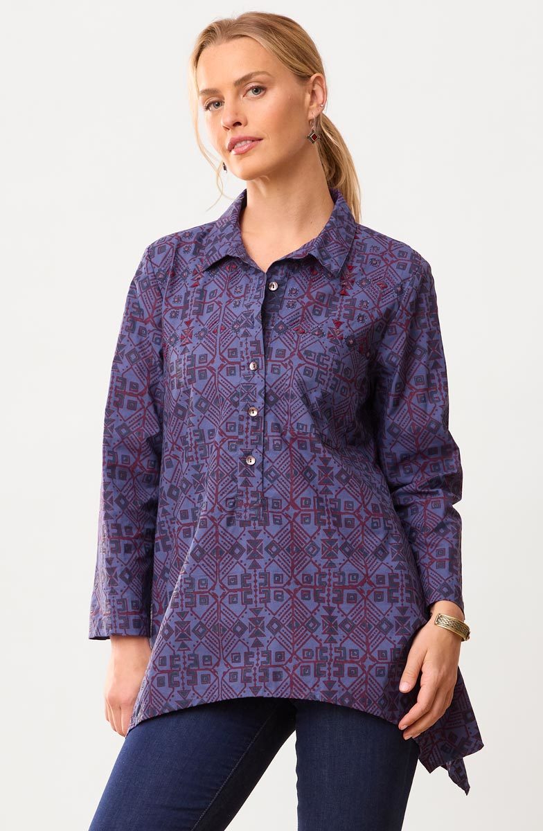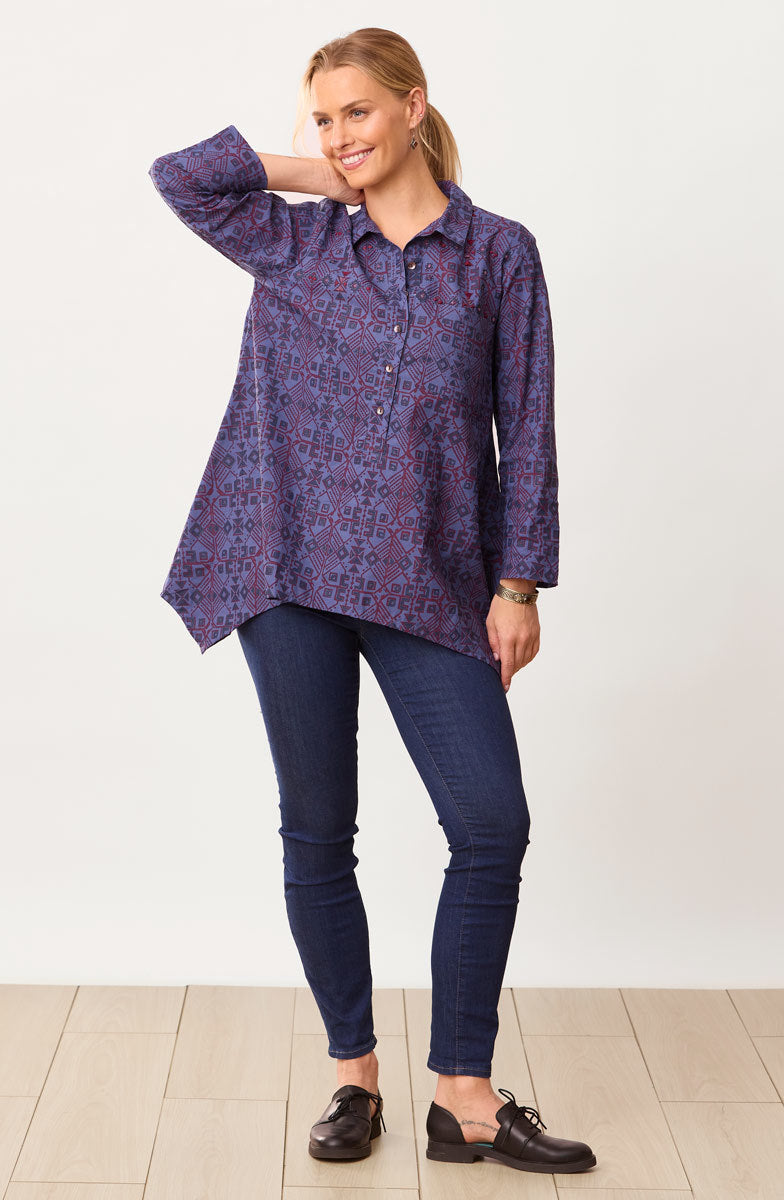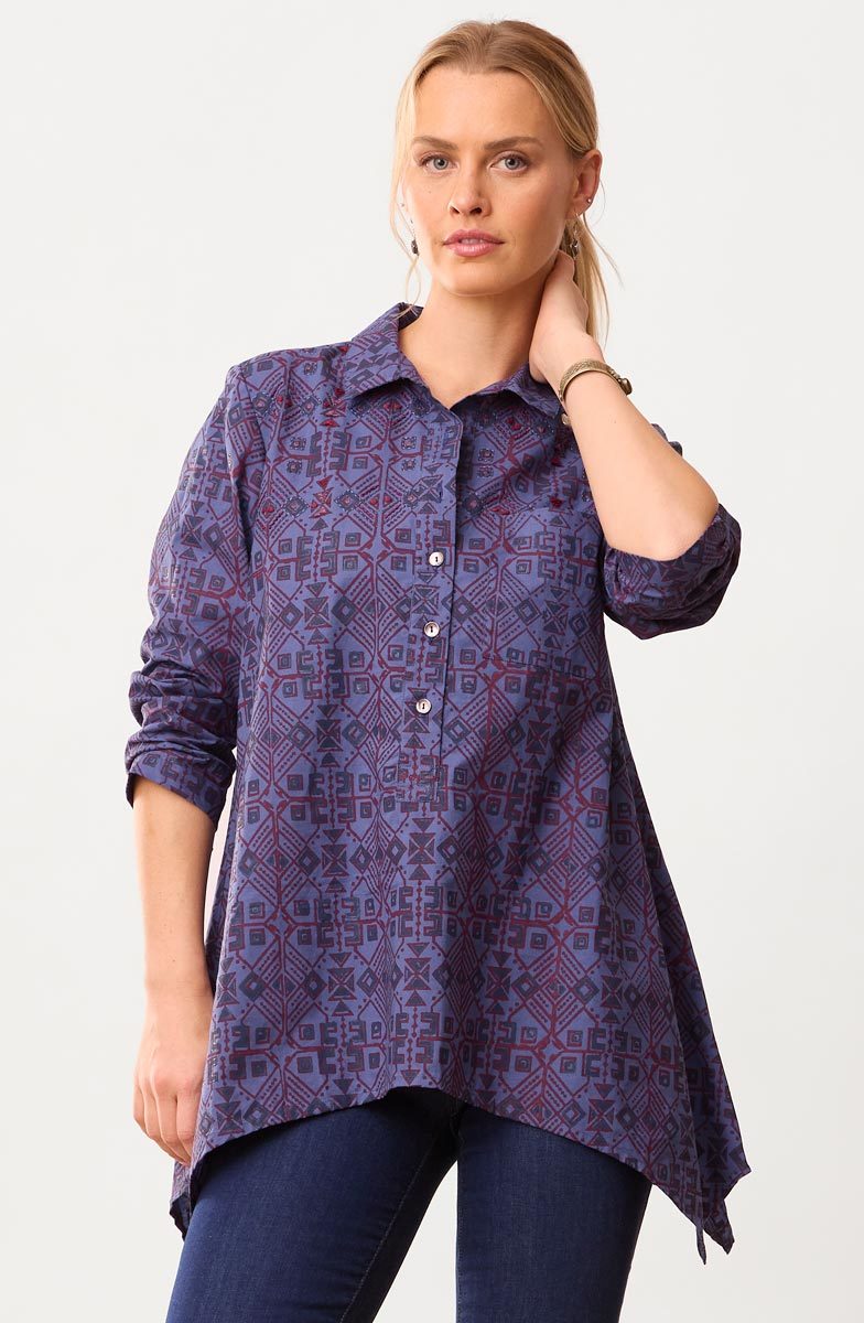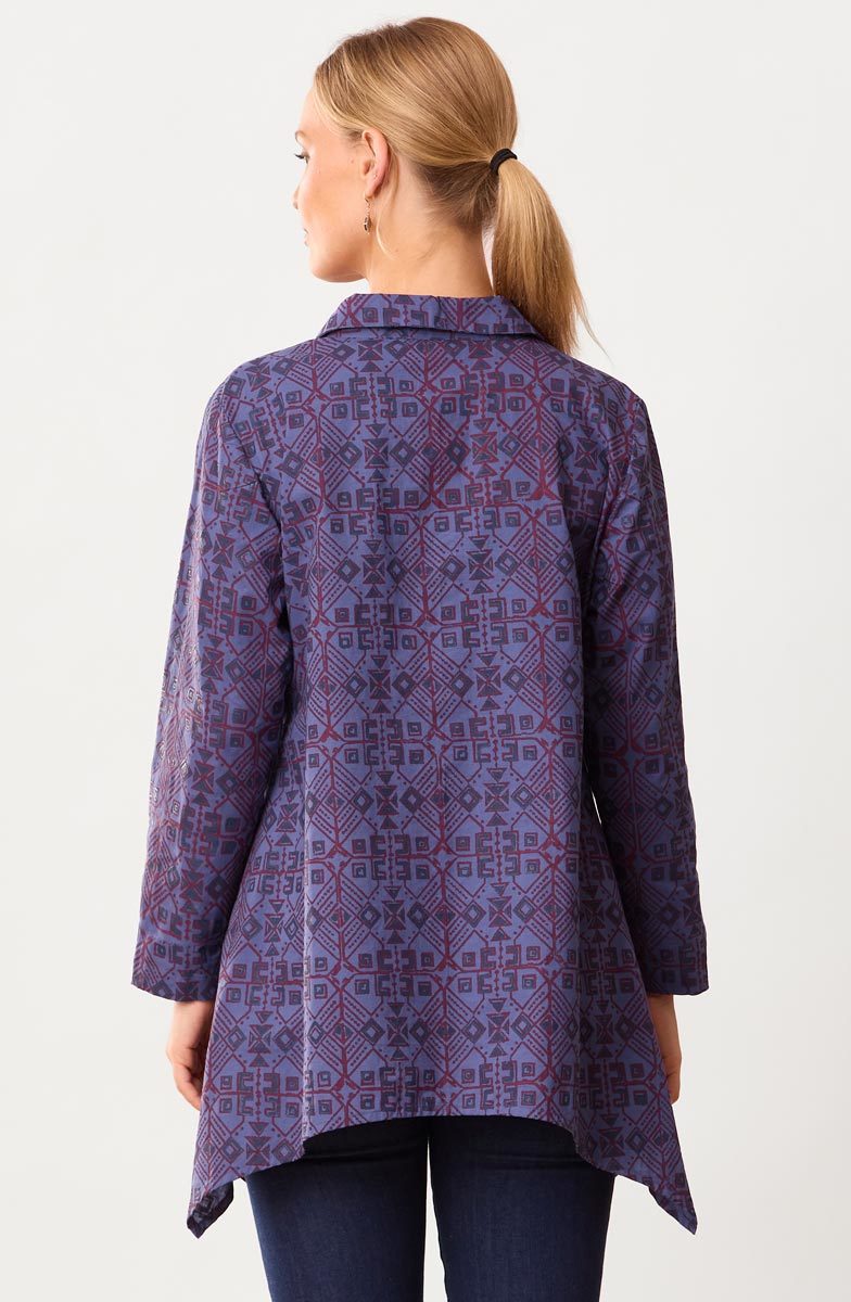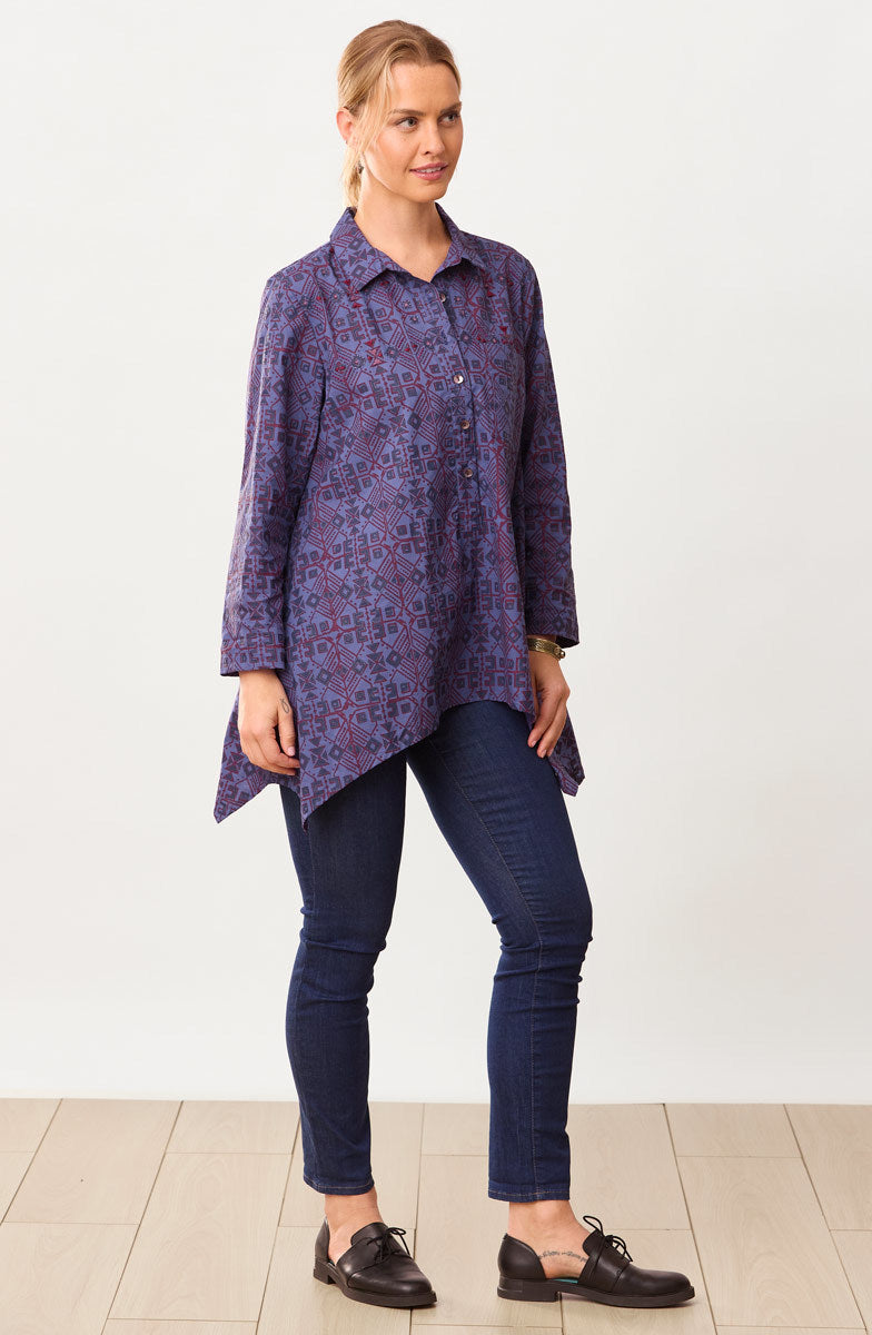 Eco-friendly A-line shirt-collar tunic with a five-button placket is handprinted in blue and red organic ink on brilliant blue organic cotton. The handkerchief hem gives a graceful sweep. Hand embroidery accents the shoulders.