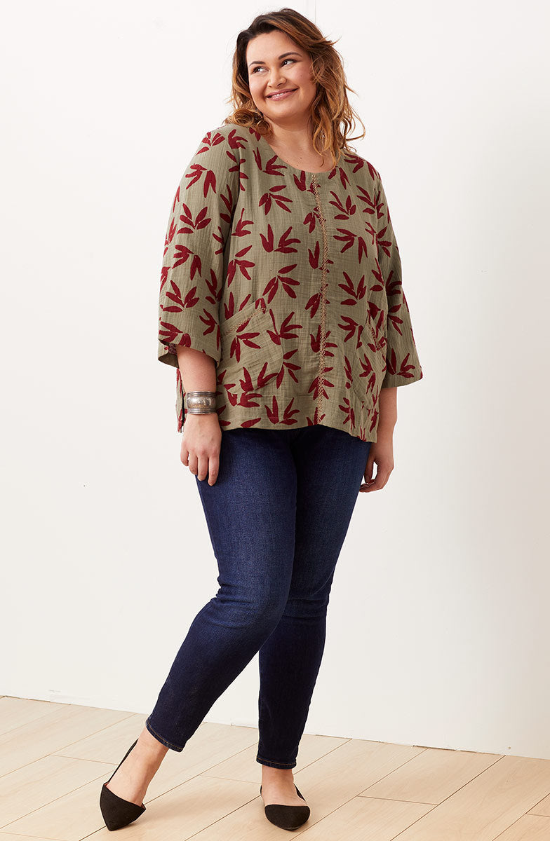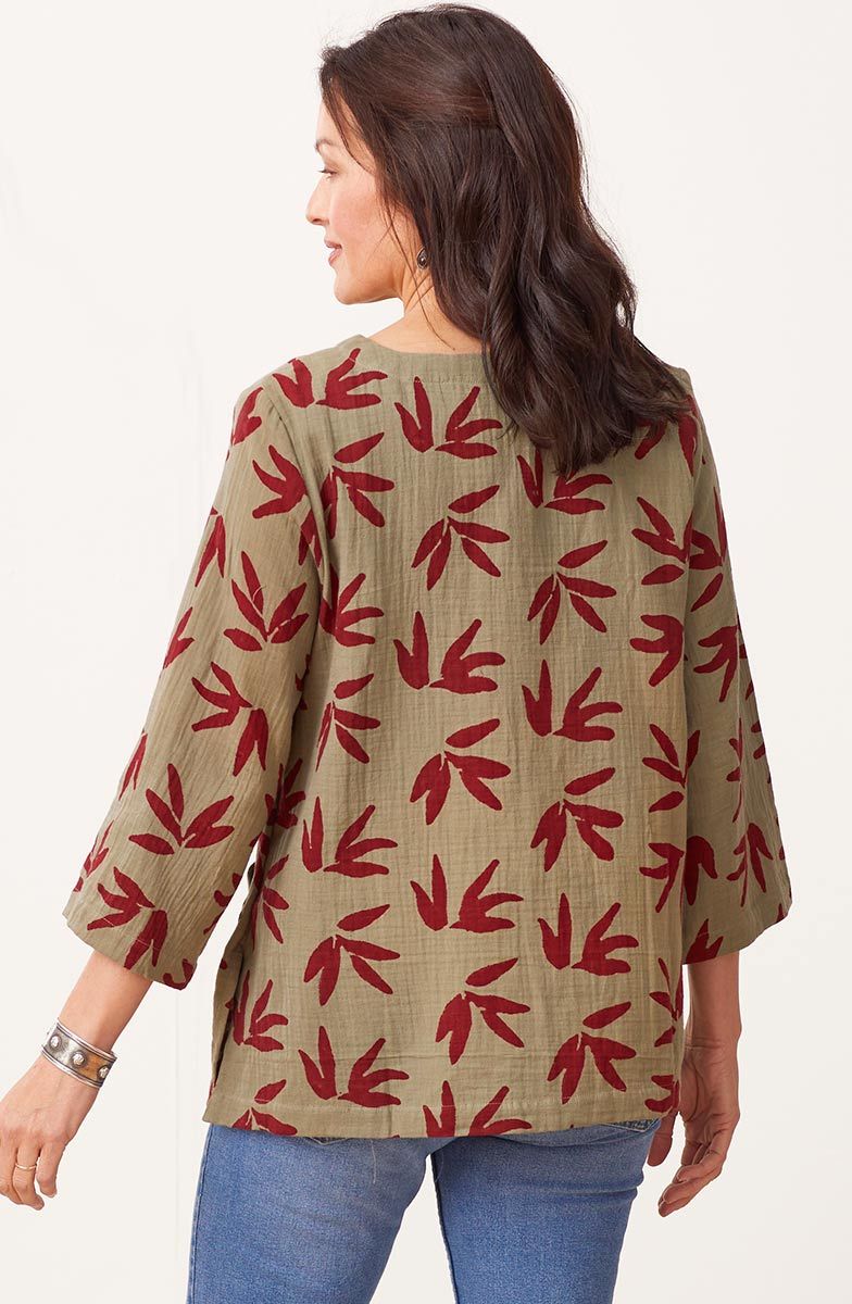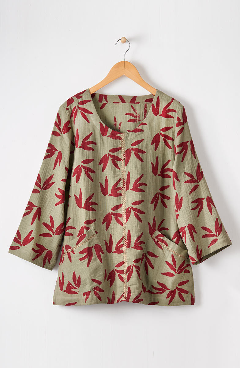 Soft double gauze makes this easy top in herbal green so comfortable and so versatile. Blockprinted with striking red leaves and accented with contrast embroidery details on the center seam and pockets. Side slits. Three-quarter length sleeves.