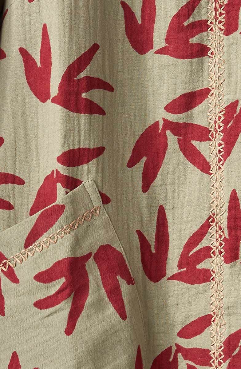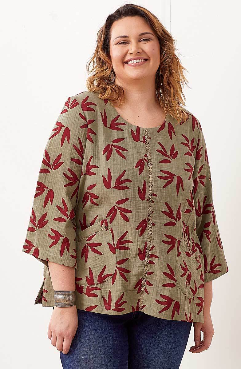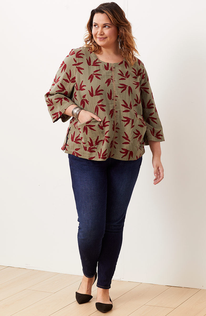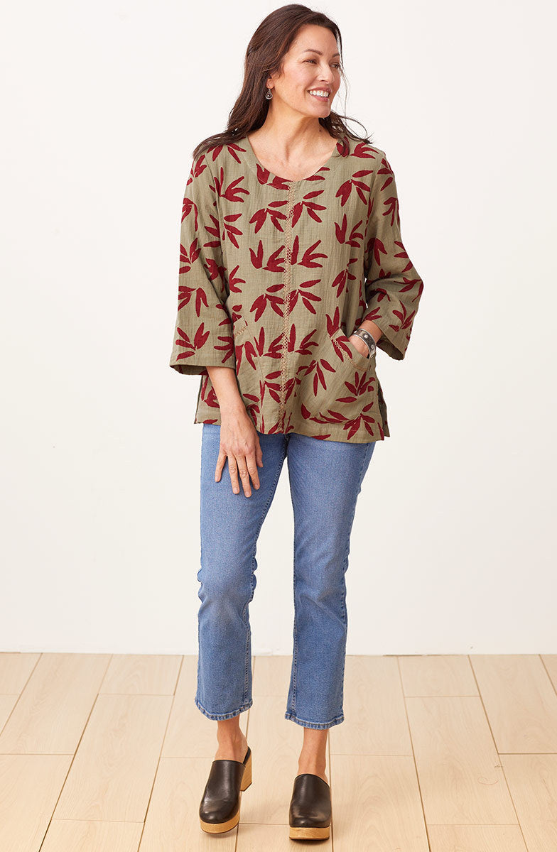 Soft double gauze makes this easy top in herbal green so comfortable and so versatile. Blockprinted with striking red leaves and accented with contrast embroidery details on the center seam and pockets. Side slits. Three-quarter length sleeves.