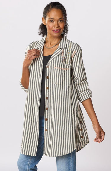 Fair Trade, Made by WARE Collective This woven stripe A-line shirt-jacket is so versatile that it works as a tunic or topper. Shirttail hem has button-up side slits so you can adjust the sweep. Long sleeves have button cuffs ready to roll up. Hand embroidery accents. Generously cut - consider sizing down for a less oversized look.