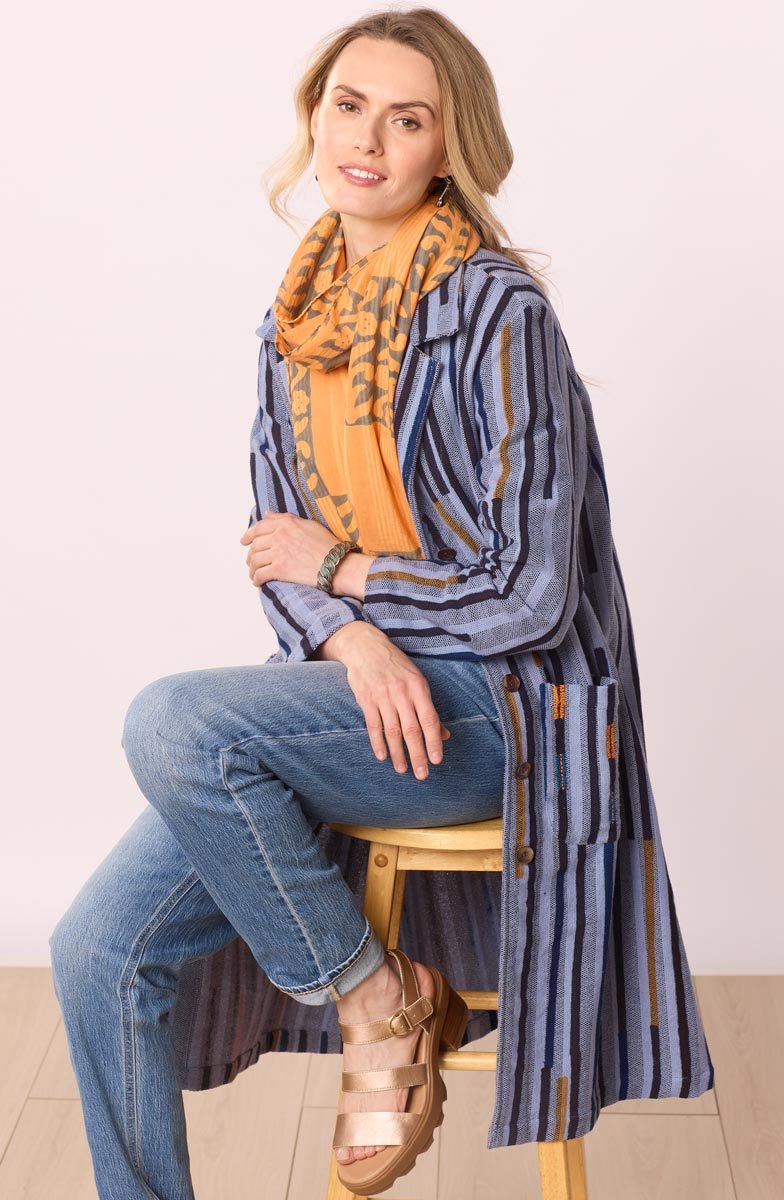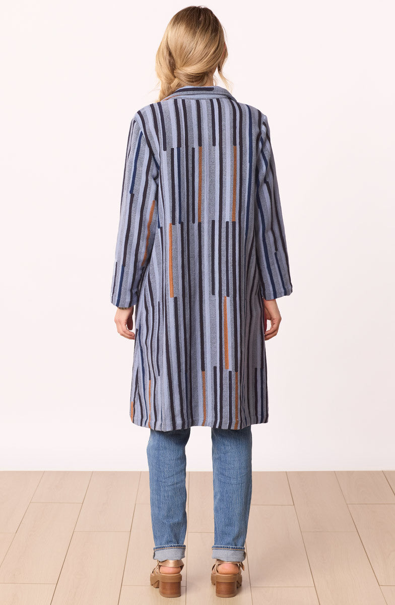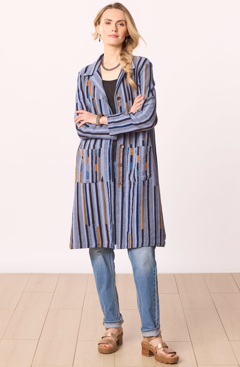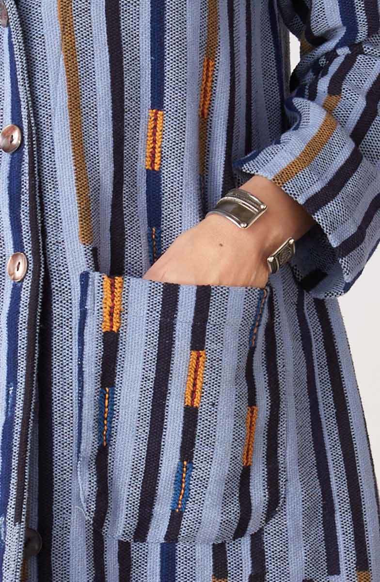 Ready for transitional weather and cool summer nights, this mid-length swing coat is made of a jacket-weight textured cotton weave with blockprinted black, blue and gold stripes over yarn-dyed stripes. Blazer styling, with full button closure and front pockets. Hand embroidery accents.
