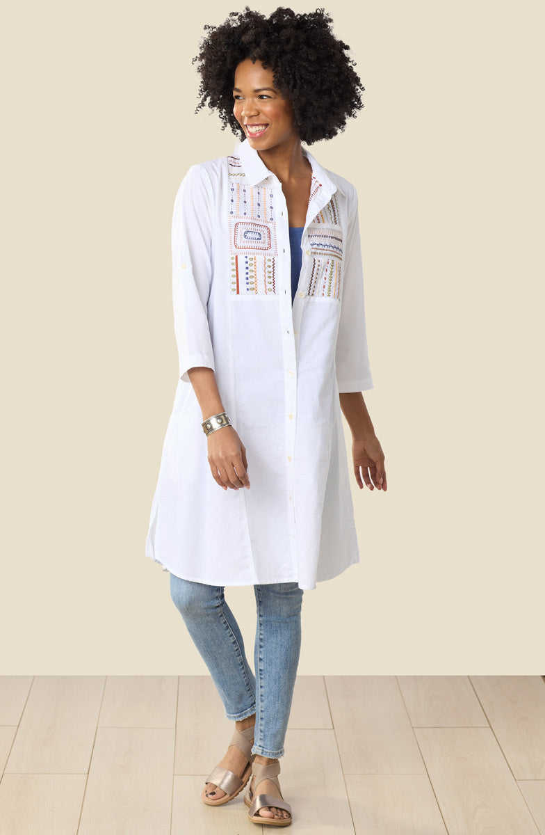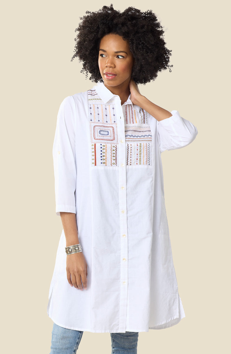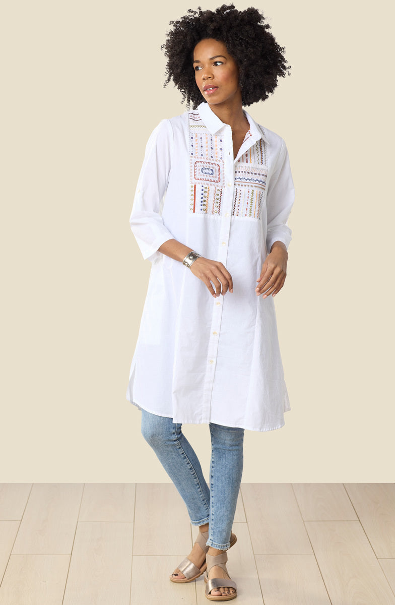 Eco-friendly A-line organic cotton shirt can double as a dress. Button-front with a hand embroidery expertise sampler on the yoke. Side slits. Long sleeves with roll-tabs, ready to roll up.