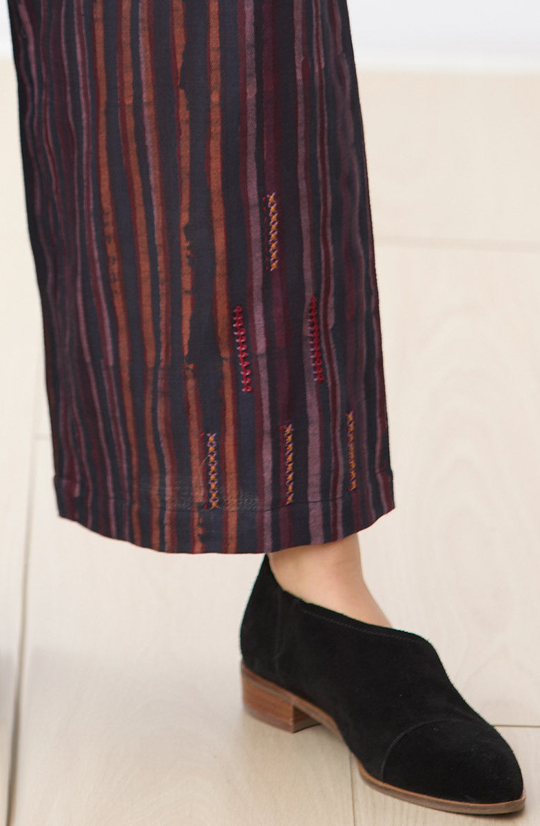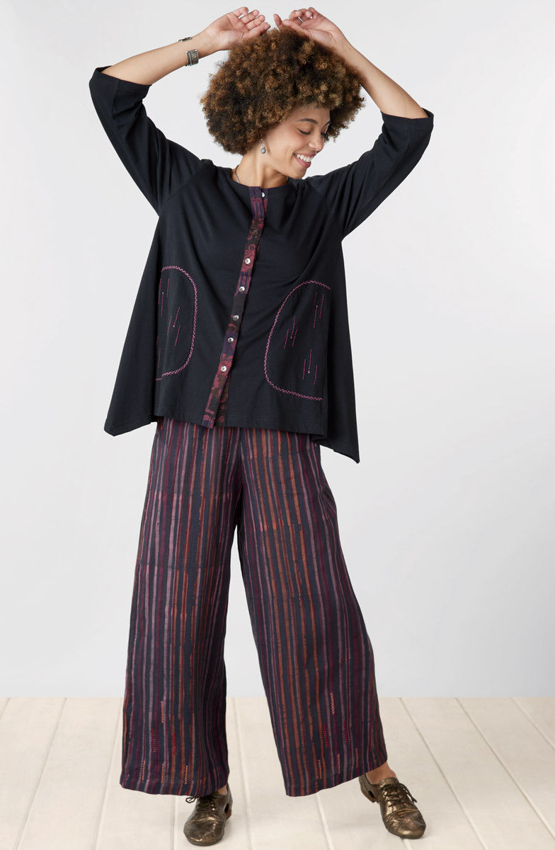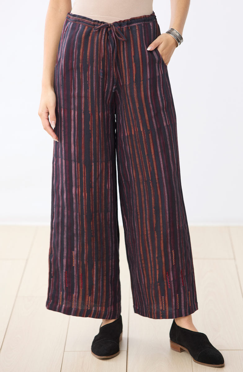 Fair Trade, Made by Aakasa Cooperative Our easy wide-leg pant in batik block print autumn colors on cotton crepe. Flat front with drawstring, elastic back. Hand embroidery accents the leg.
