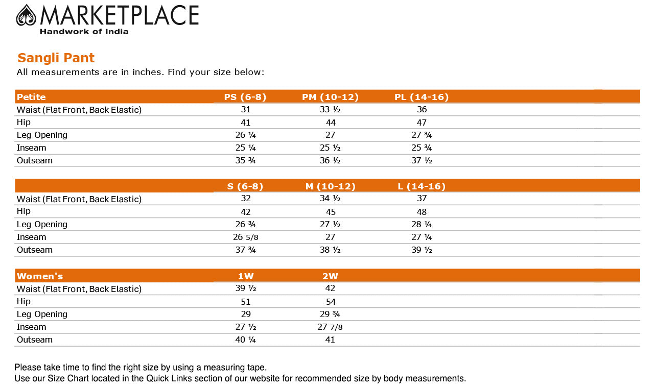 MarketPlace garments are designed to have a relatively loose fit. The jackets and vests are sized to layer over shirts, tops, or a sweater. The length of the pants is either the outer seam measurements or the inseam measurement, as stated in the product description. Please take time to find the right size by using a measuring tape. Garment Measurement charts are located on each product page. Most Marketplace products are 100% cotton, but the fabrics are pre-washed so shrinkage is minimal. Feel free to contact us if you have any questions.