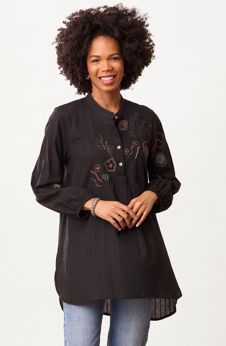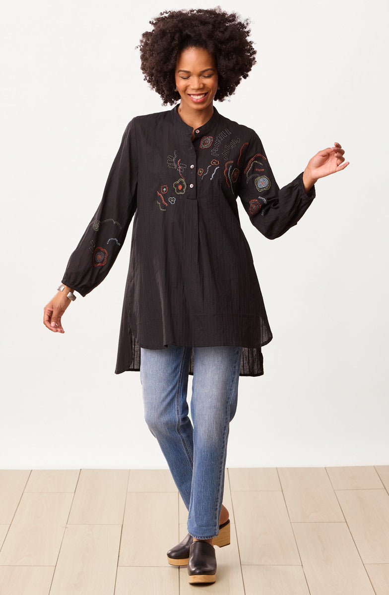 Lightweight textured cotton tunic features a curved buttoned yoke with a center box pleat. Playful blue, green and orange hand embroidery decorates the bodice. Longer back hem gives a great sweep. Back center pleat. Long sleeves with elastic.