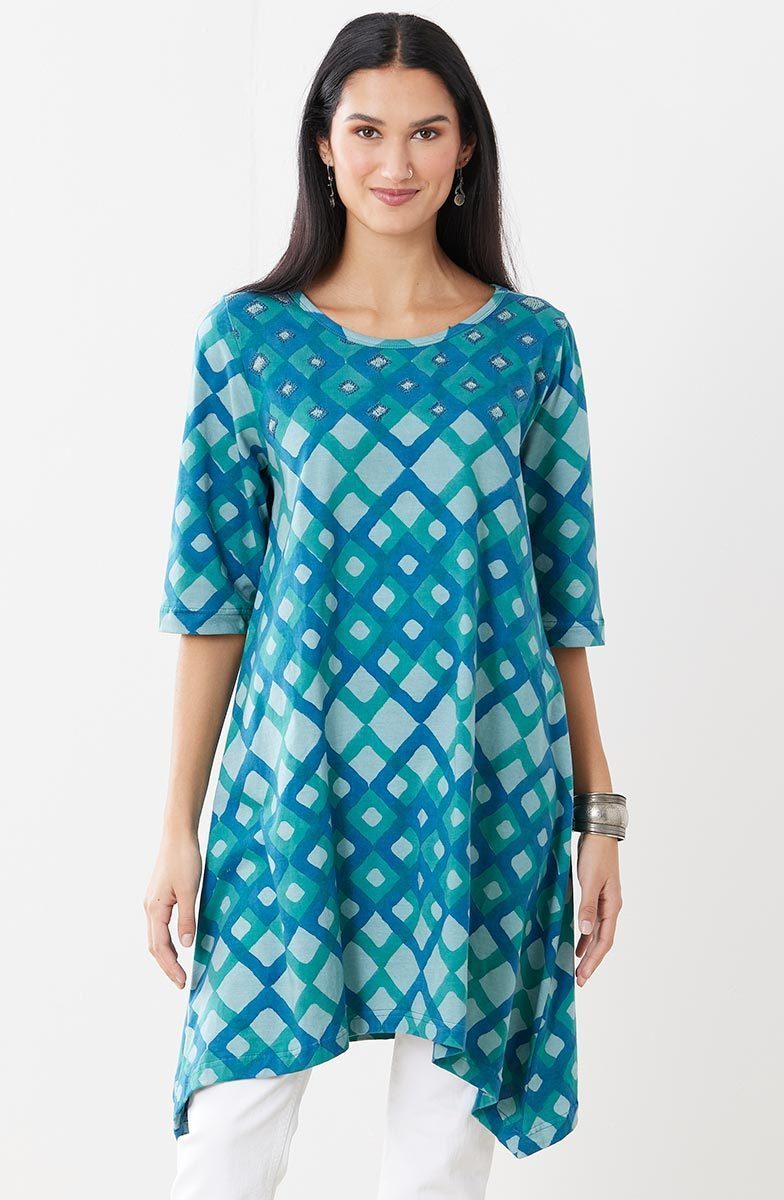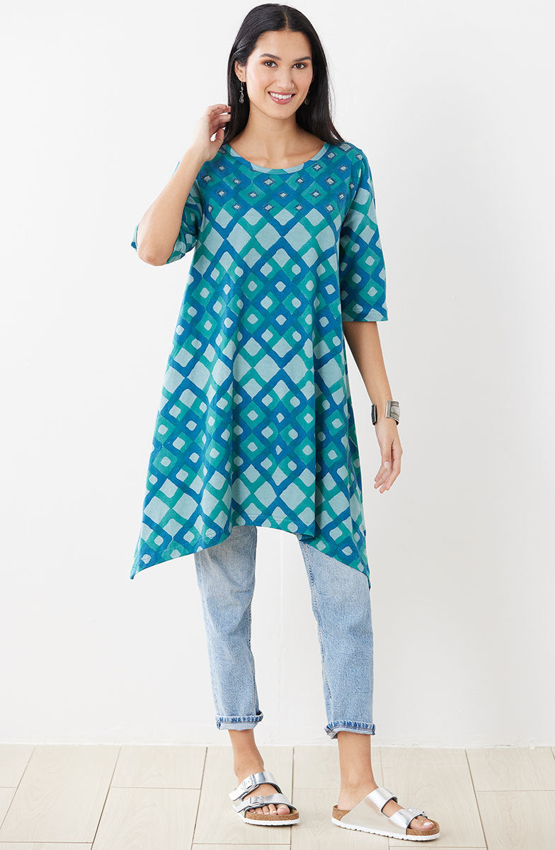 Soft jersey long tee in aqua blues and greens handprint is ready to pair with pants or leggings. The knit tunic has a handkerchief hem and hand embroidery embellishments.