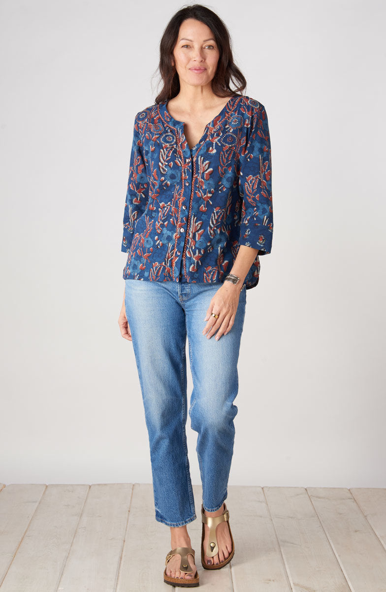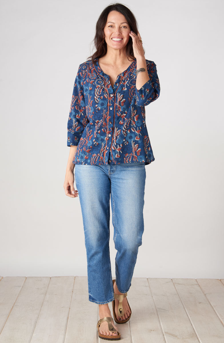 Floral block prints handprinted in natural indigo and brick-red combine on this lightweight cotton notch-neck top. Hand embroidery accents the placket and the shoulder print design. Curved hem, side slits. Three-quarter length sleeves.
