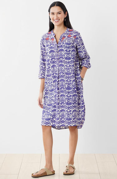 Fair Trade, Made by Prerna Cooperative Long shirt blockprinted in rich purple is ready to layer or to wear alone. The notch-neck tunic has a band collar with button placket and shirttail hem. Long sleeves with button cuffs. Orange and red hand embroidery accents the neckline.