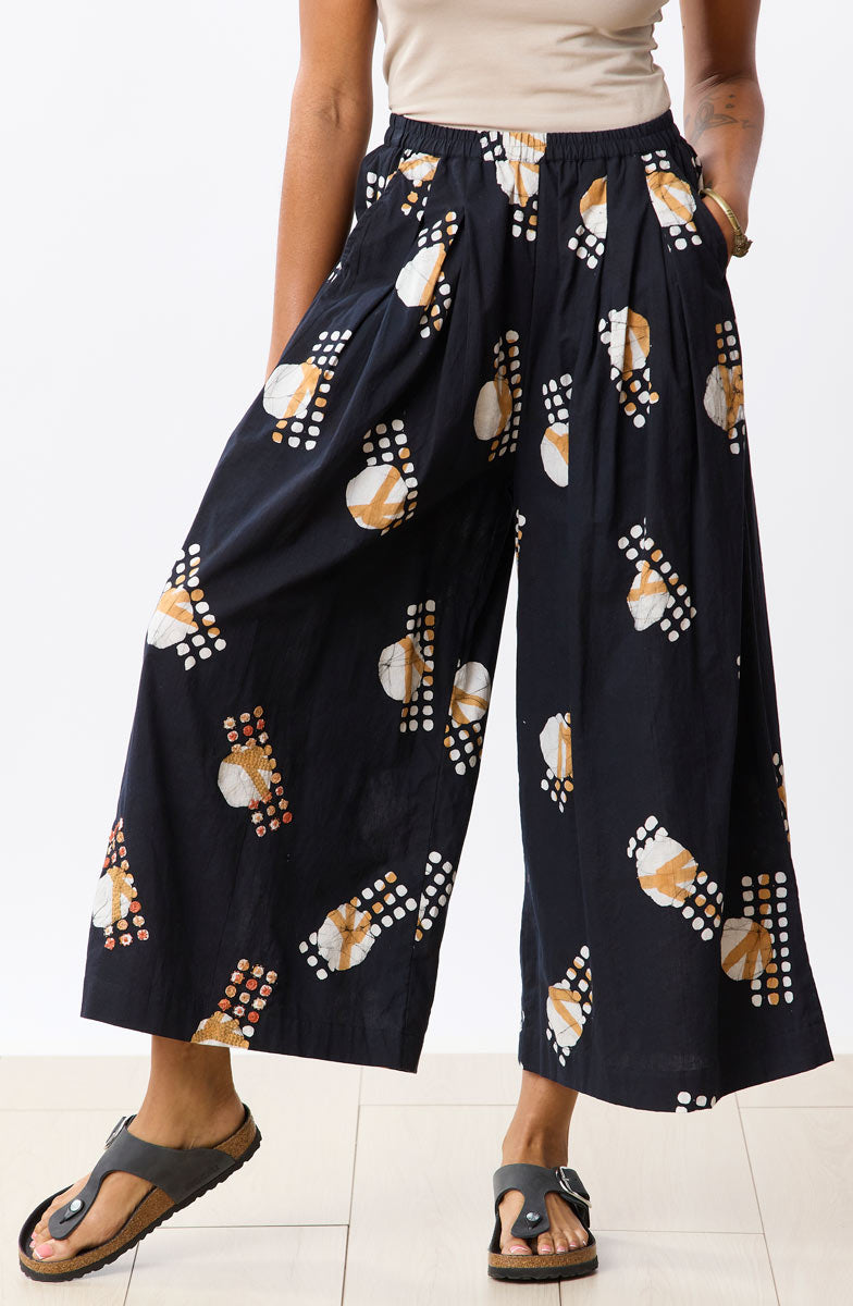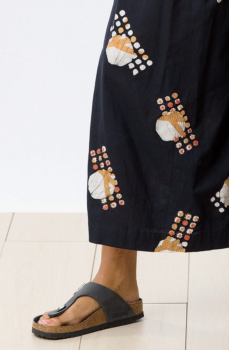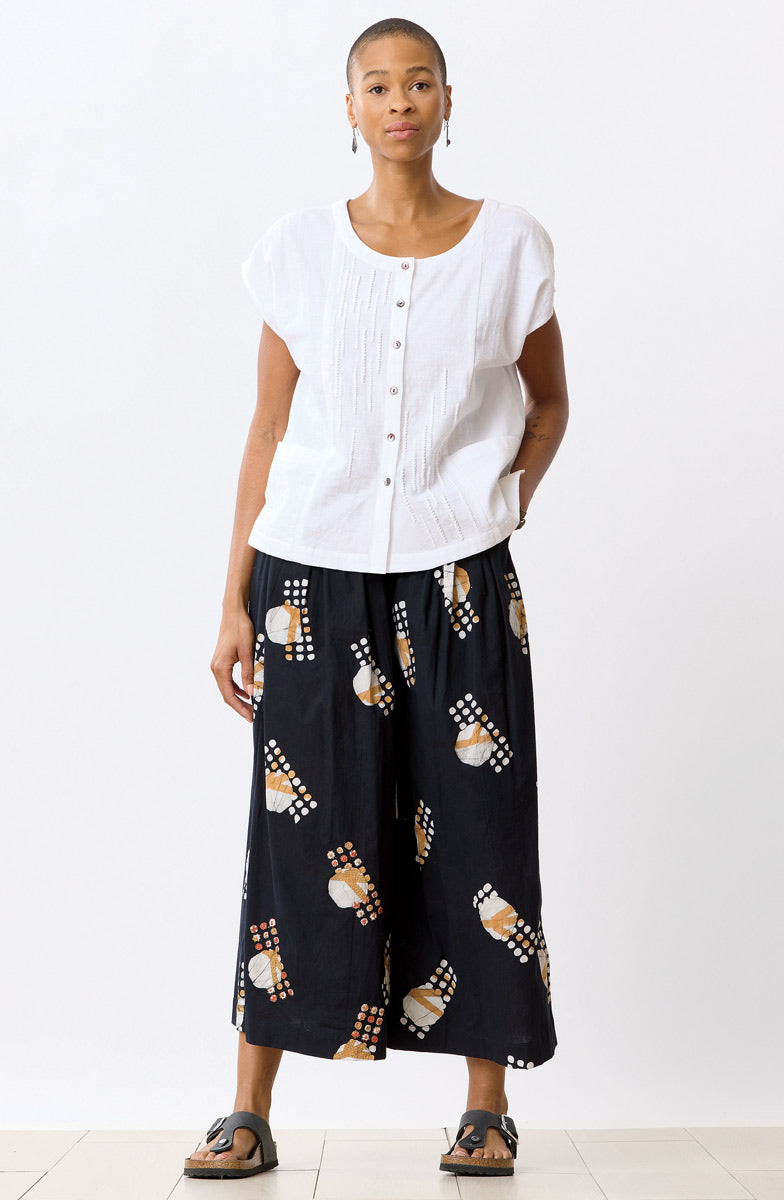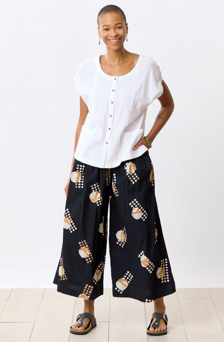 The comfort of pants meets the movement of a split skirt. Hand block and hand painted batik in natural and sandy brown, with an elastic waist, practical side pockets and front pleats that fall beautifully on the body. Hand embroidery adds an artisanal finish.