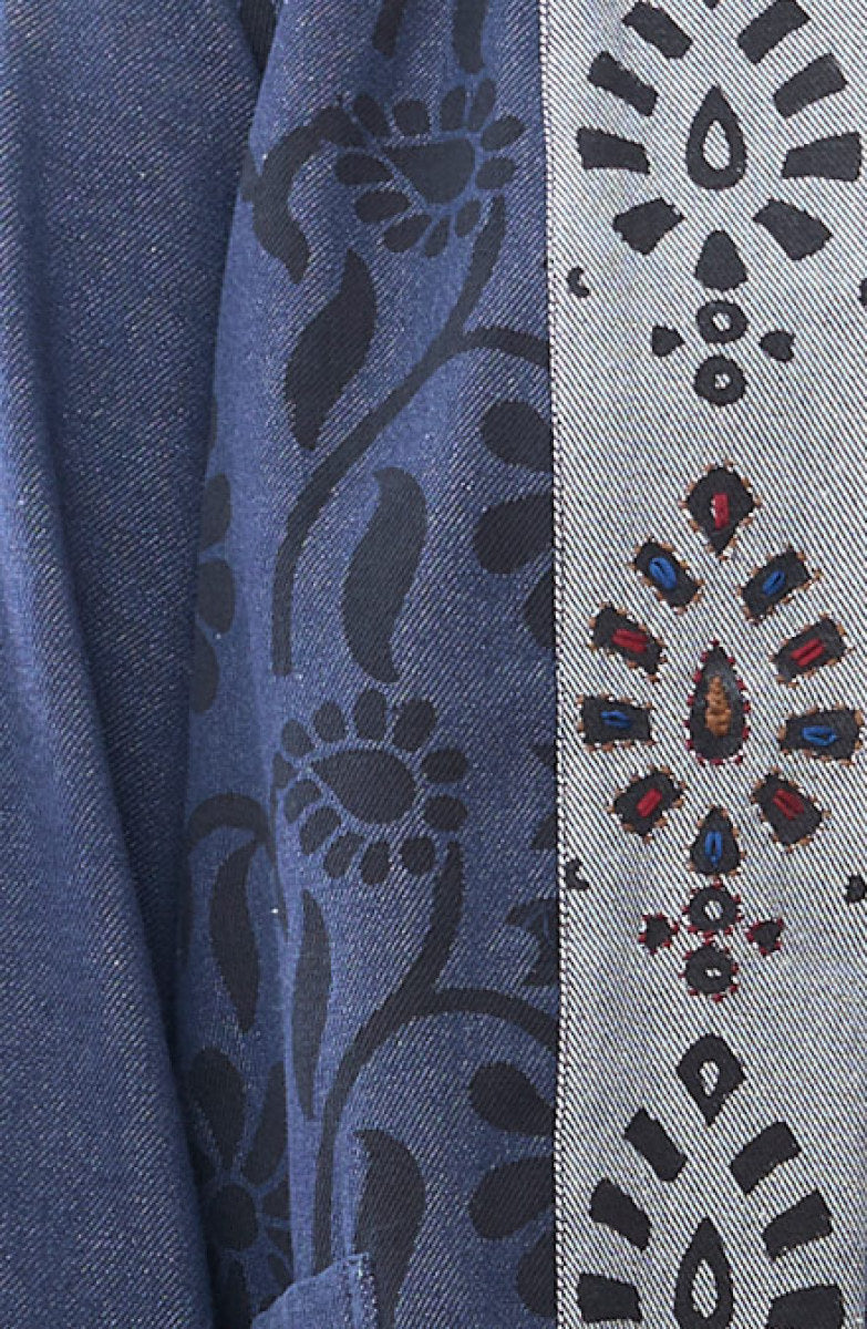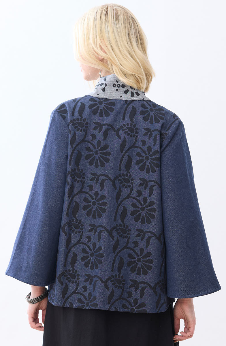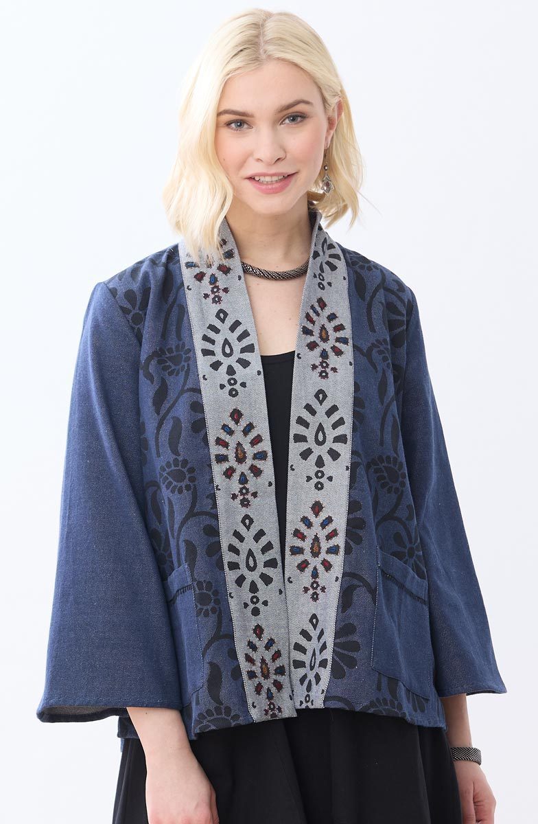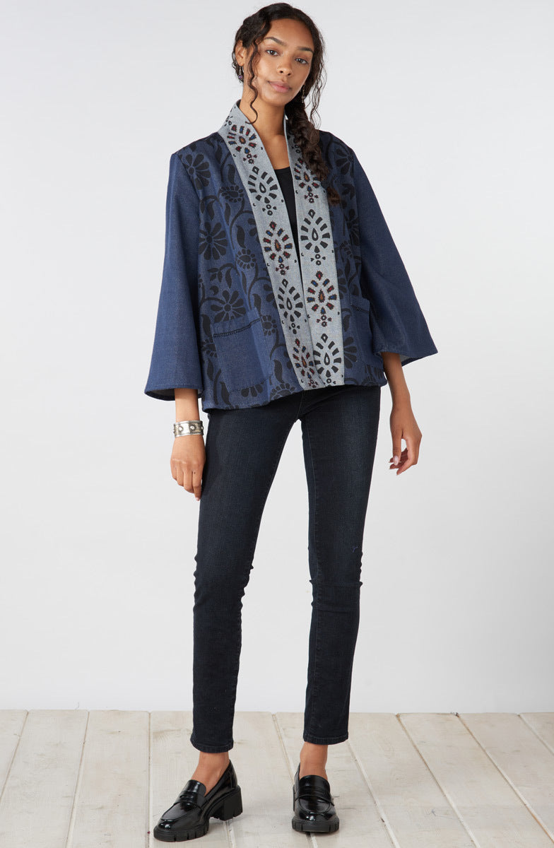 A little fun, a little swingy, this medium-weight handwoven eco-friendly recycled-yarn denim jacket accented with a floral blockprint has an embroidered contrasting shawl-collar and lapels. Gently flared long sleeves. Hand embroidery highlights the lapels adding artisanal detail to this versatile piece. A durable and sustainable choice, hearty denim handwoven with recycled fibers blends strength and eco-consciousness. The handwoven texture adds a unique artisanal touch, while the incorporation of recycled materials reduces waste.