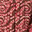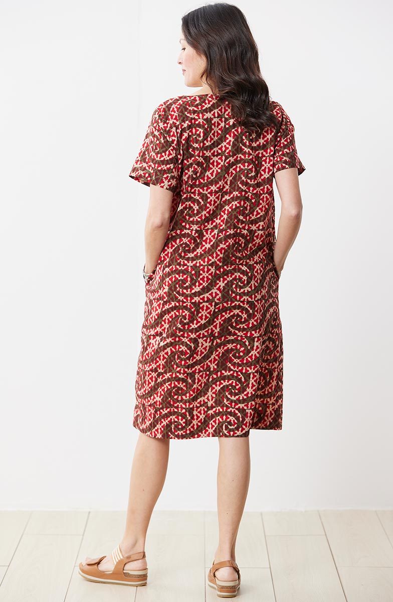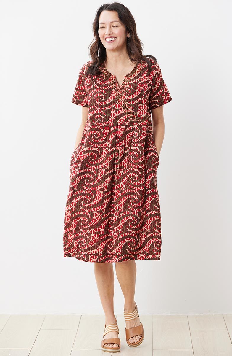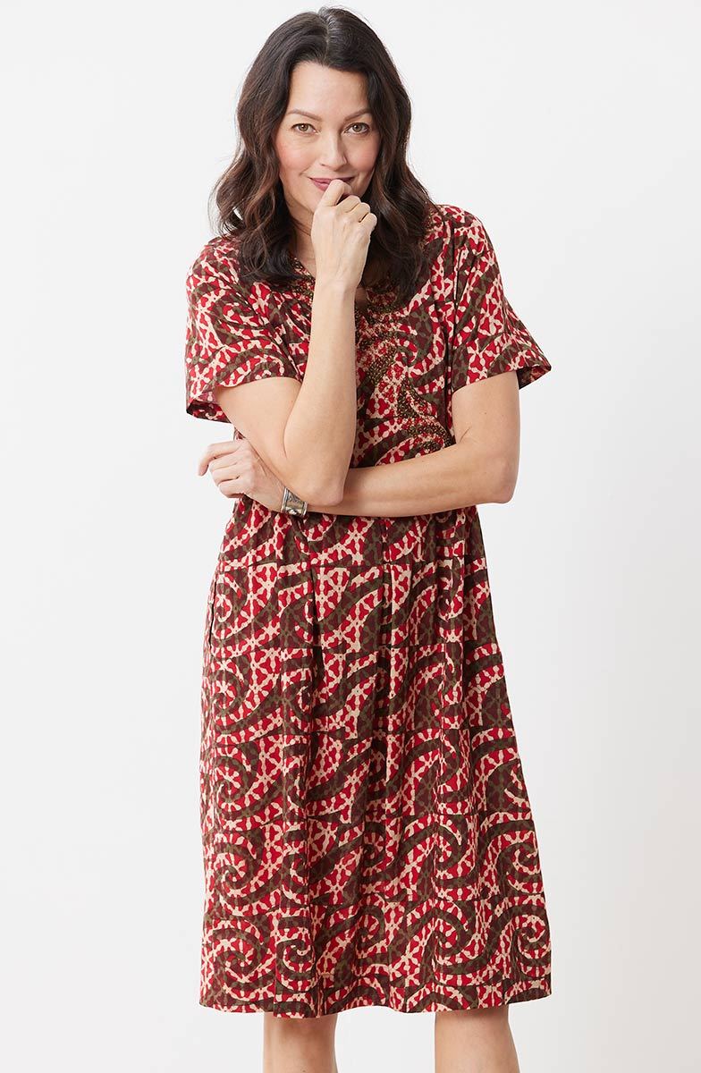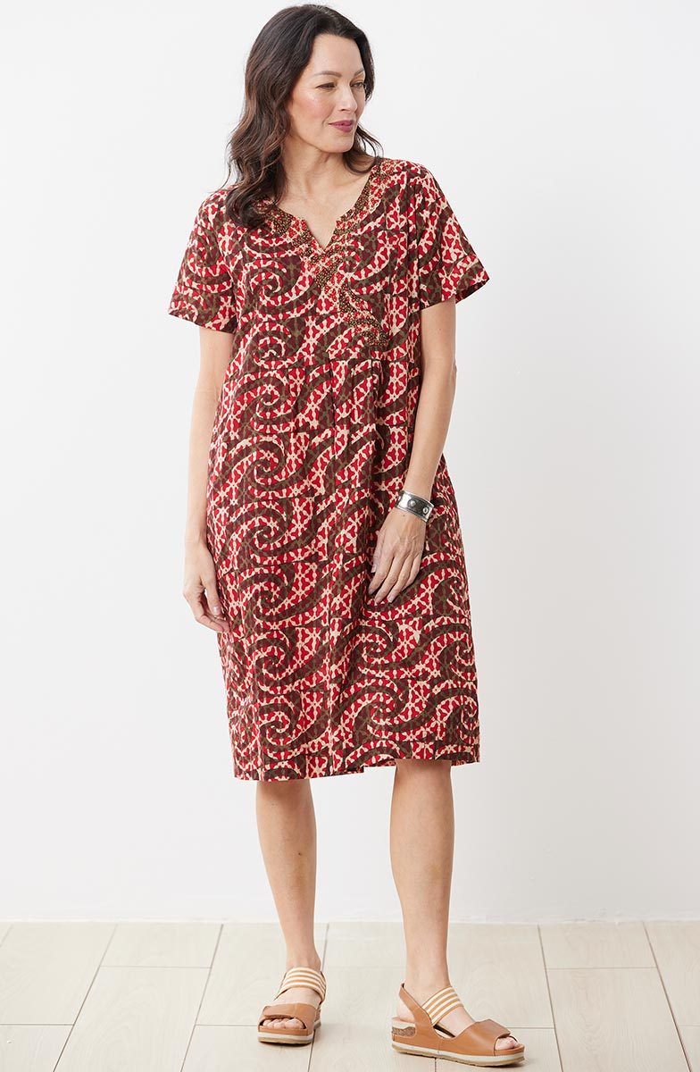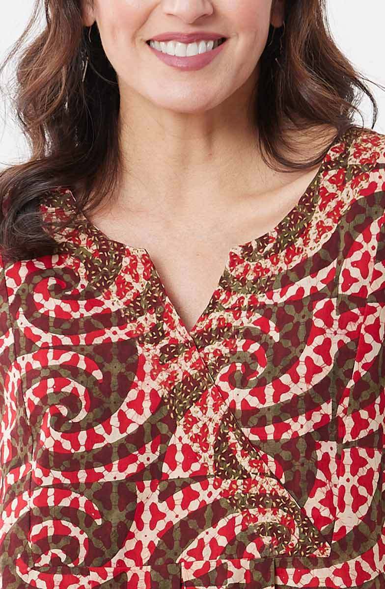 Fair Trade, Made by Ghar Udyog Collective Notch-neck pullover dress in a spicy red batik block print with olive green accents. The faux-wrap yoke with box pleats has intricate hand embroidery highlighting the neckline.
