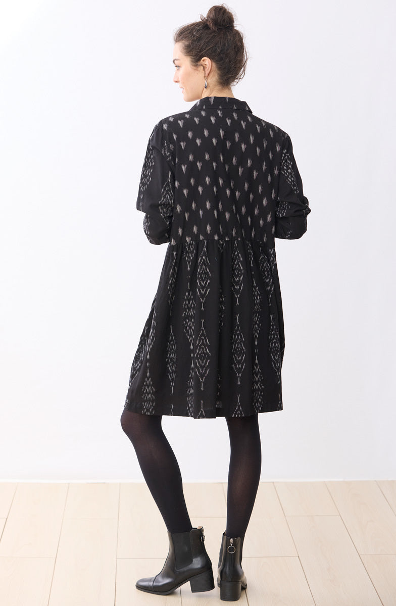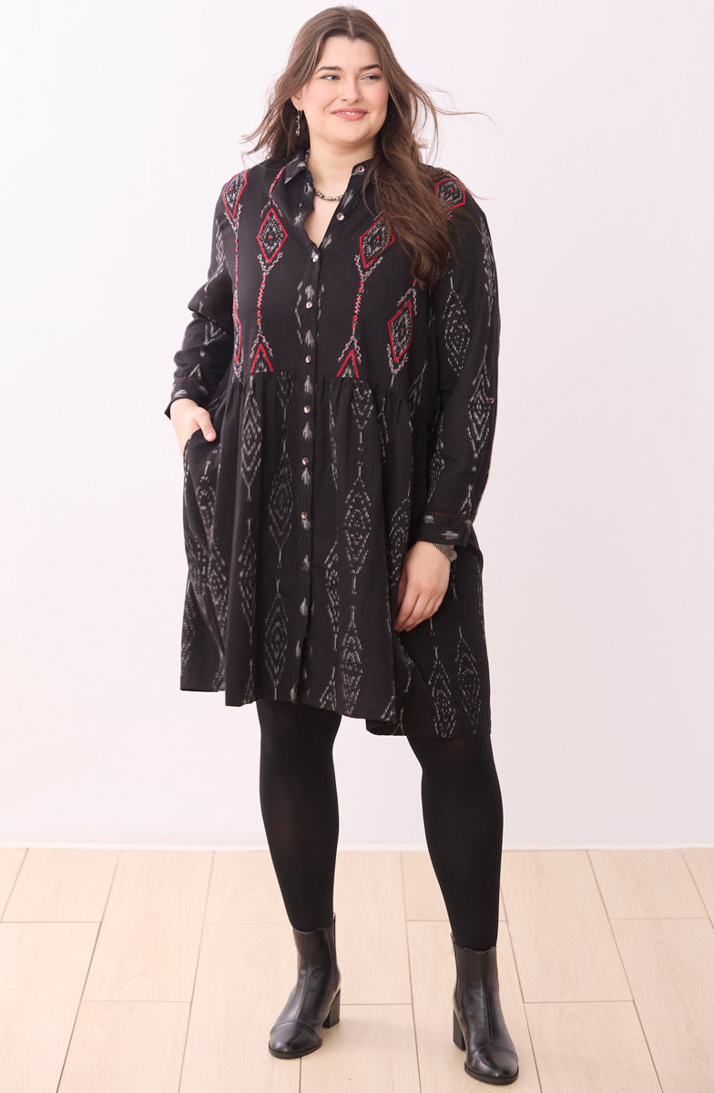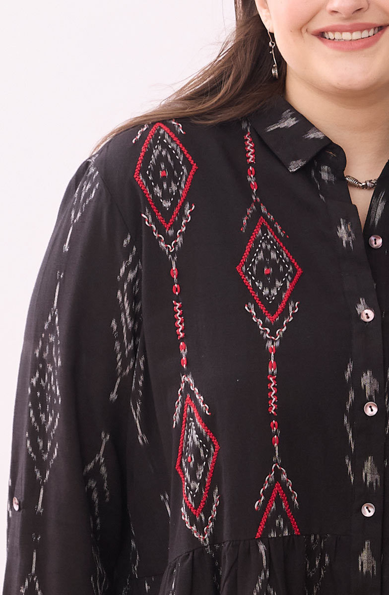 Our shirt-styled dress in classic black Ikat with red contrast hand embroidery highlighting the bodice. With shoulders that are a little dropped, plus a drop-waist and soft gathers, it fits like a slightly oversized shirt and works great as a tunic. Long sleeves, button cuffs. Generously cut - consider sizing down for a less oversized look.