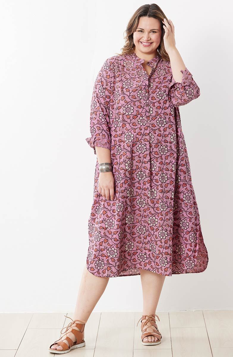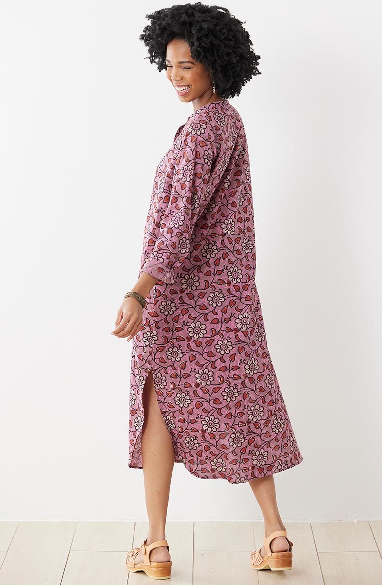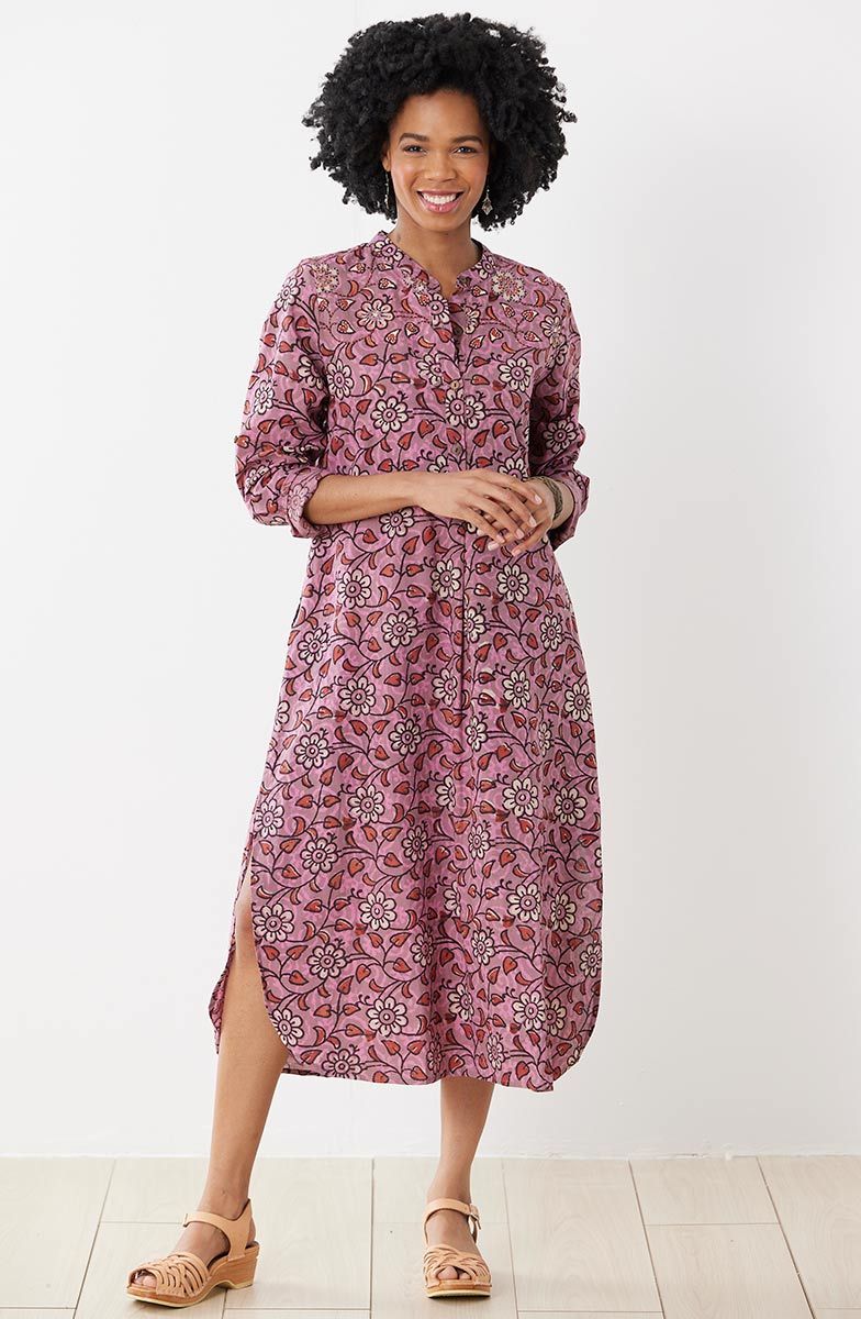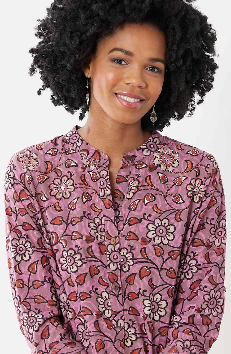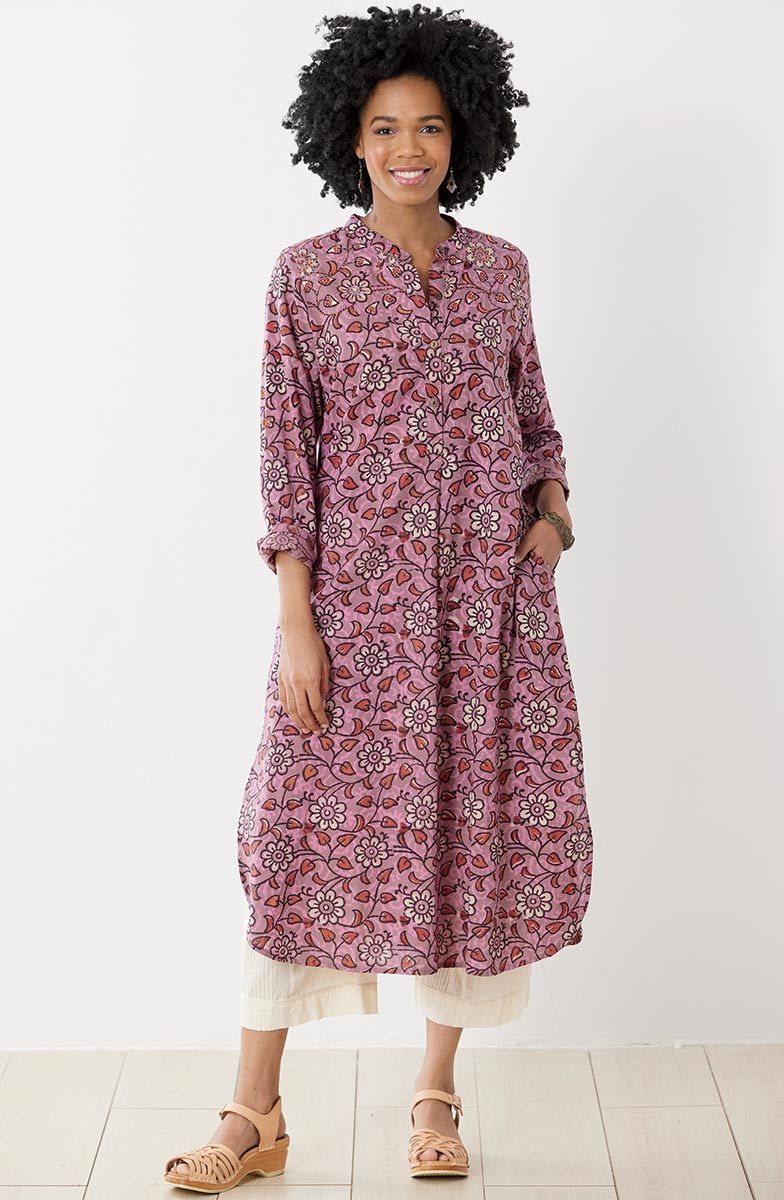 Long kurta dress with curved hem and deep side slits, blockprinted with natural dye in rose-pink and dark orange florals. Band collar with button placket, button cuffs. Hand embroidery highlights the print design on the shoulders. Wear alone or pair with a MarketPlace pant!