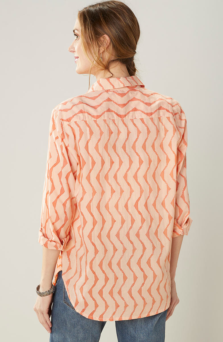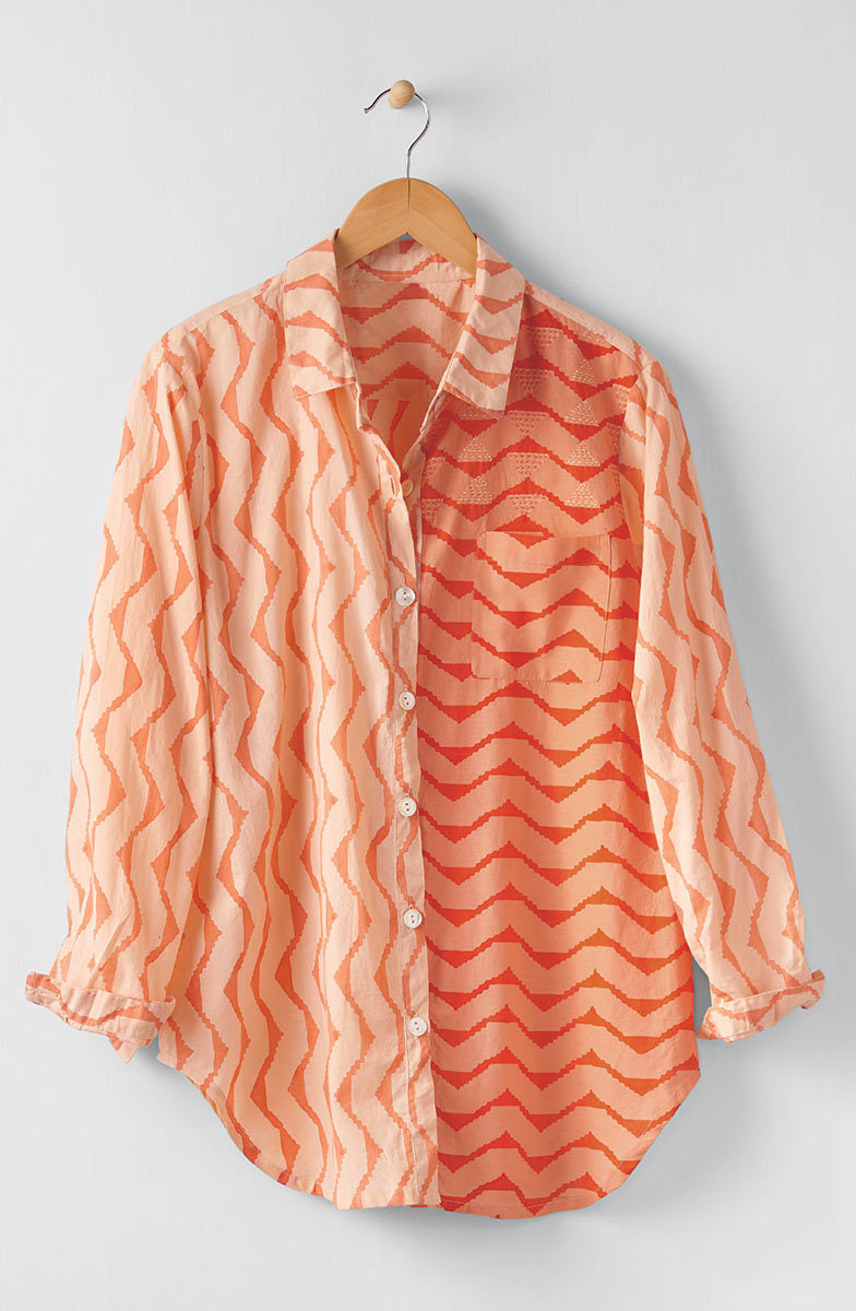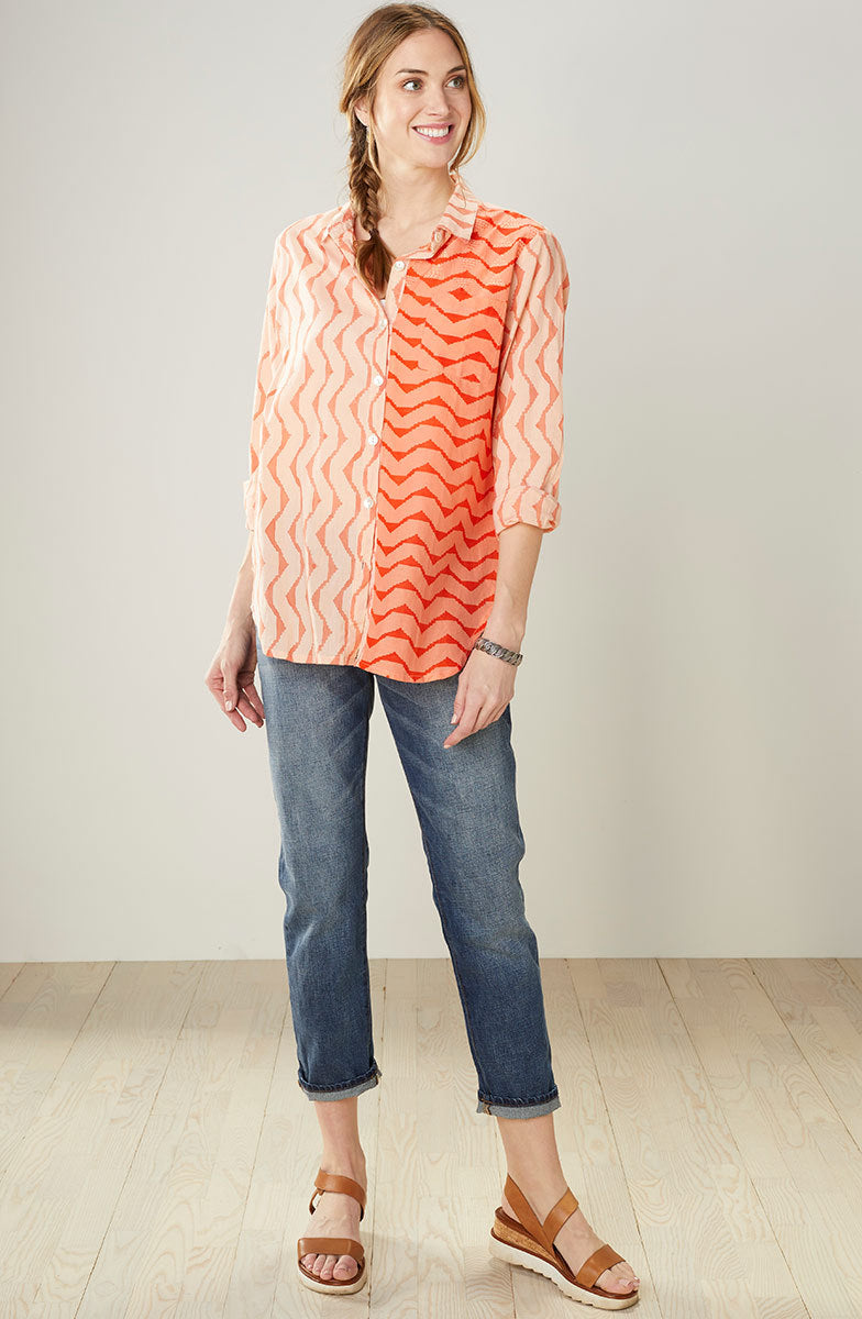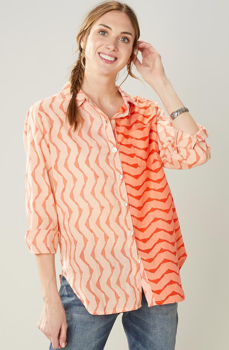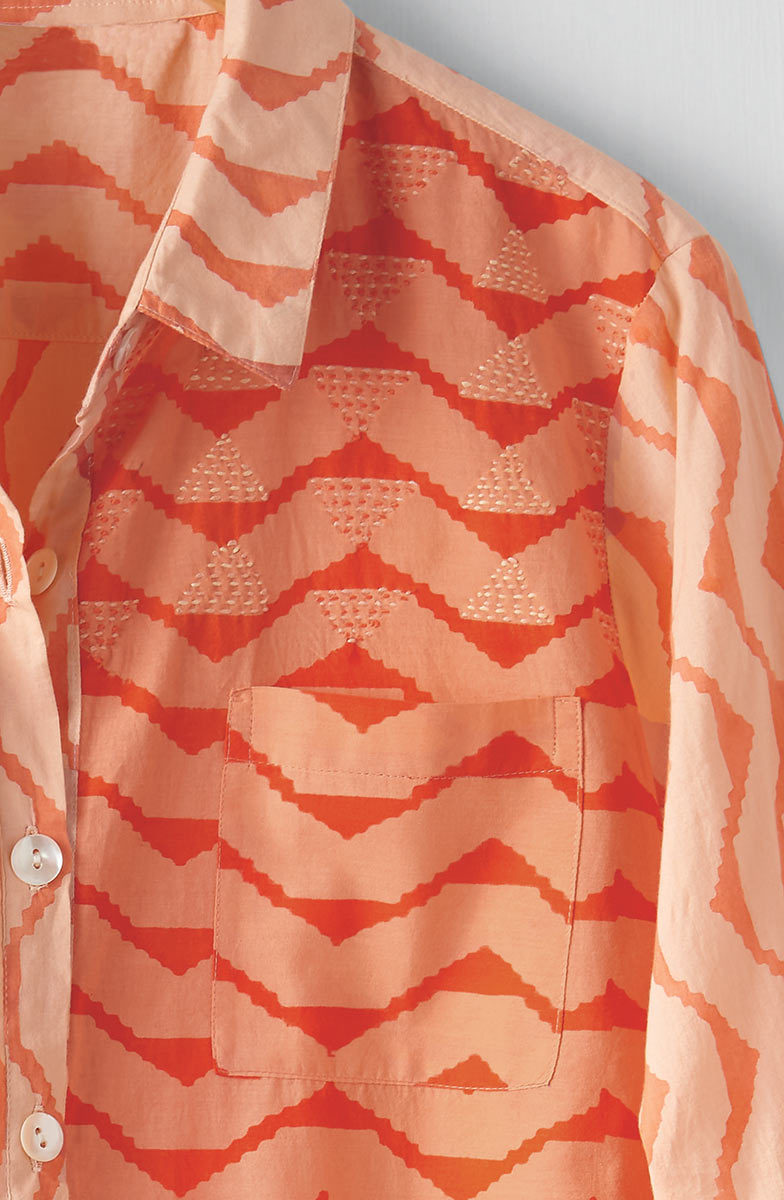 A classic shirt in bright orange-hued block prints on lightweight cotton. Button cuffs, shirttail hem. Hand embroidery on contrast panel shoulder. Straight shaping, fits true to size.