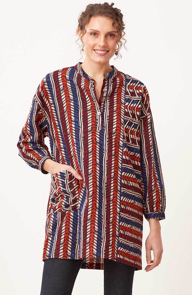 Vibrant block print of black, blue, red and orange -- look closely at the design for the hidden birds! This pullover big shirt has a hand-embroidered contrast panel and pocket. Band collar and cuffed sleeves ready to roll up. Generously cut - consider sizing down for a less oversized look.