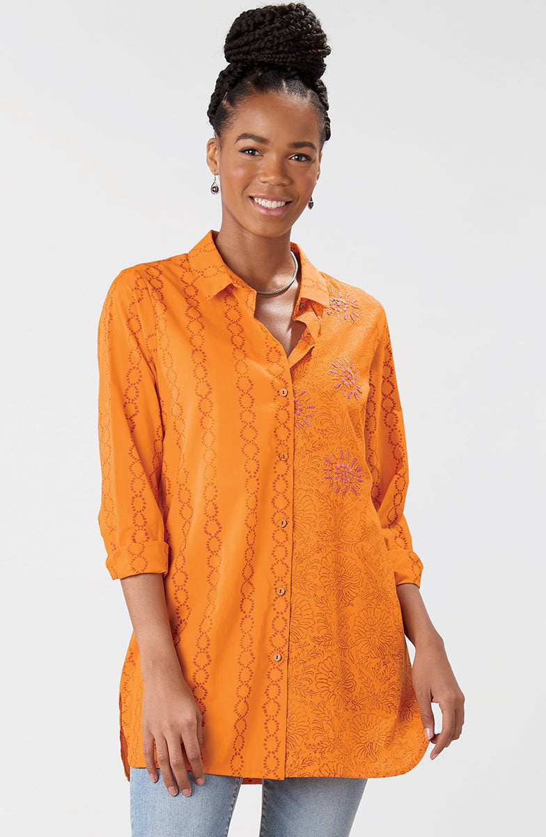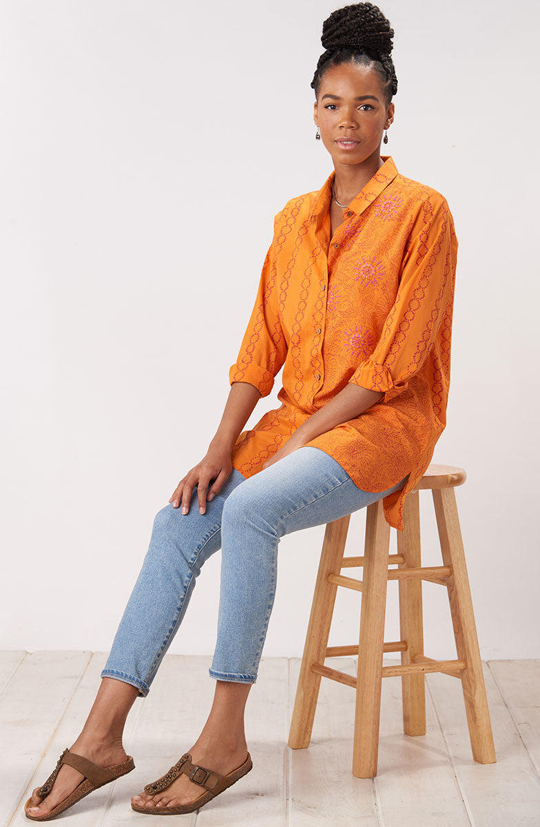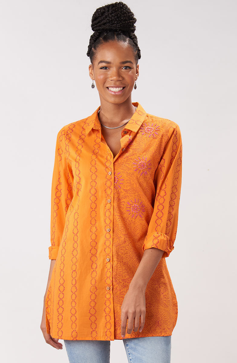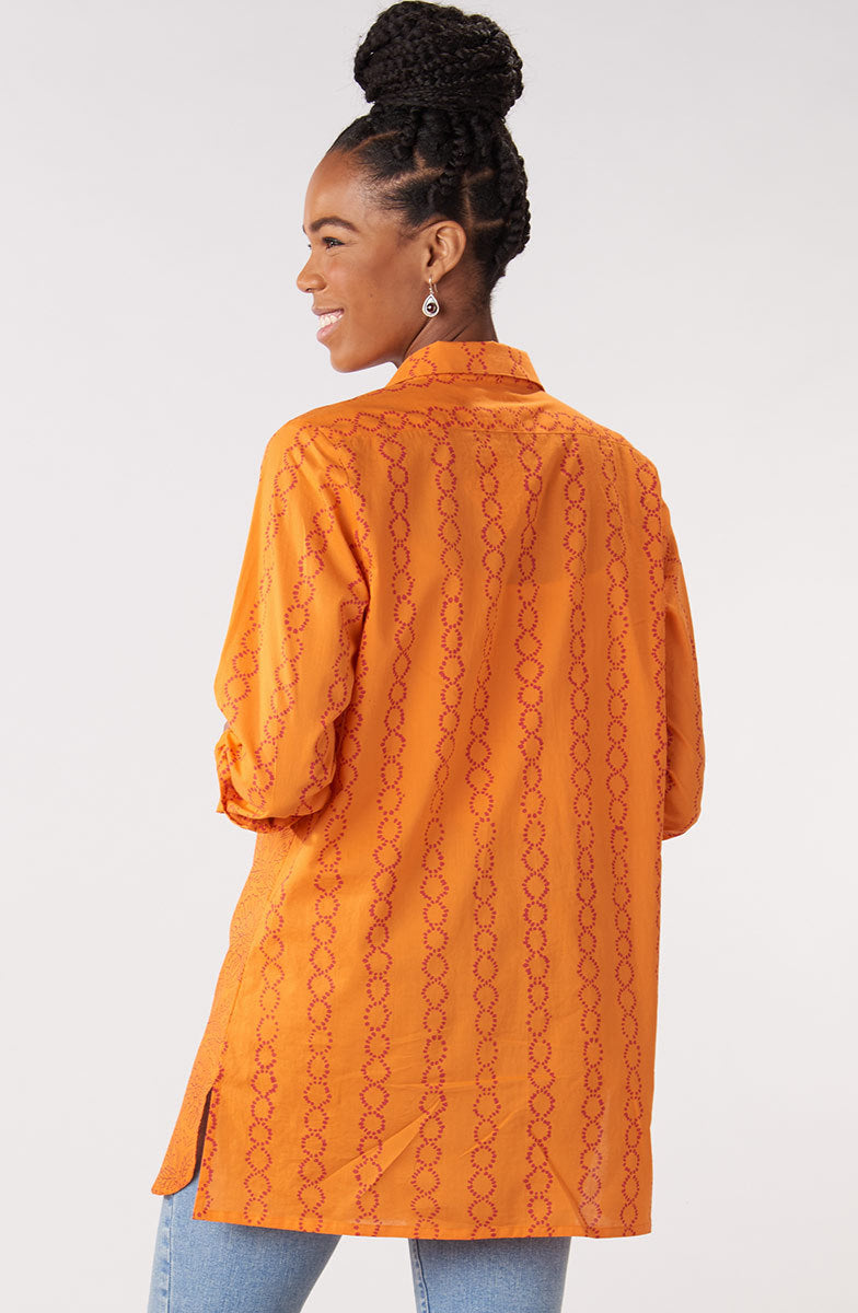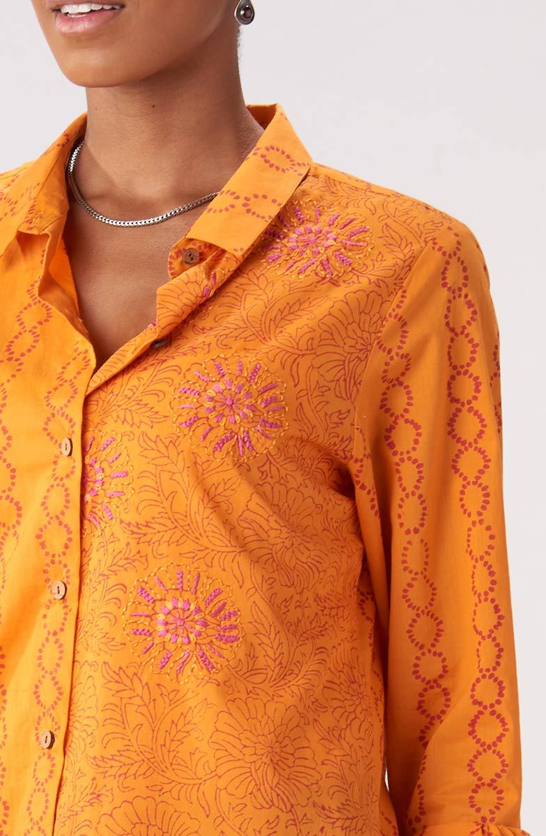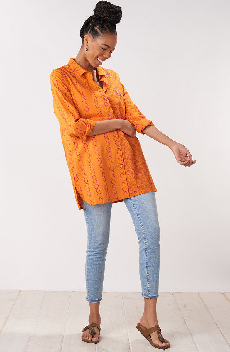 Organic cotton voile classic shirt has that special softness which organic cotton brings. Printed in organic ink on an orange background with tonal embroidery highlighting the print design. Button cuffs, side slits. Slightly sheer, ready to layer over a cami.