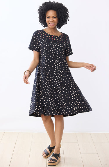 Fair Trade, Made by Ghar Udyog Collective Handprinted A-line knit dress with an asymmetrical seam is ready to wear two ways. The extra-long slash pockets on the front seams are great as pockets -- or they pull out to become optional front ties! Hand embroidery accents the bodice.