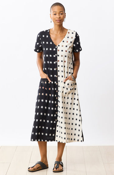 A simple yet elegant A-line dress, perfect for spring and summer and one you’ll reach for again and again. Rendered in classic black-and-white double ikat, it features short sleeves, side slits and practical pockets.