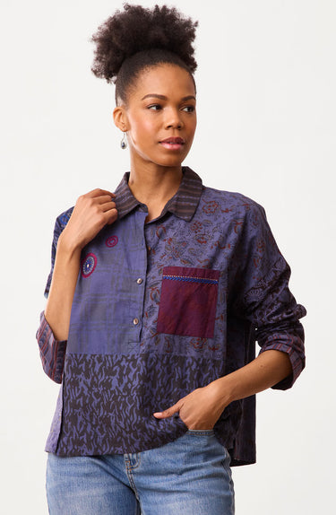 Boxy blue collage top features a mix of upcycled deadstock blockprinted designs, including a deep red contrast panel and pocket. Shirt-styling with a back yoke and button placket. Button detail at hem. Slightly dropped shoulders for a relaxed fit. Hand embroidery embellishments. While the dominant color is blue, collage colors and patterns may vary due to the variety of deadstock fabrics.